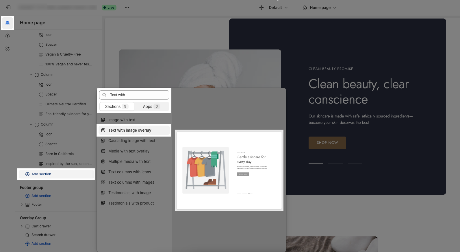 Step 2: In the theme editor (Customize), click the Sections button > Click the Add section button > In the Sections tab, scroll through the list or use the search bar to find and select Text with image overlay.