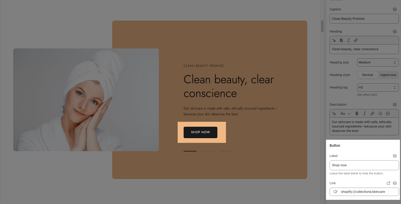 Link: The URL or page path where the button should direct users when clicked. You can paste an external link or search for an internal page/product in your store.