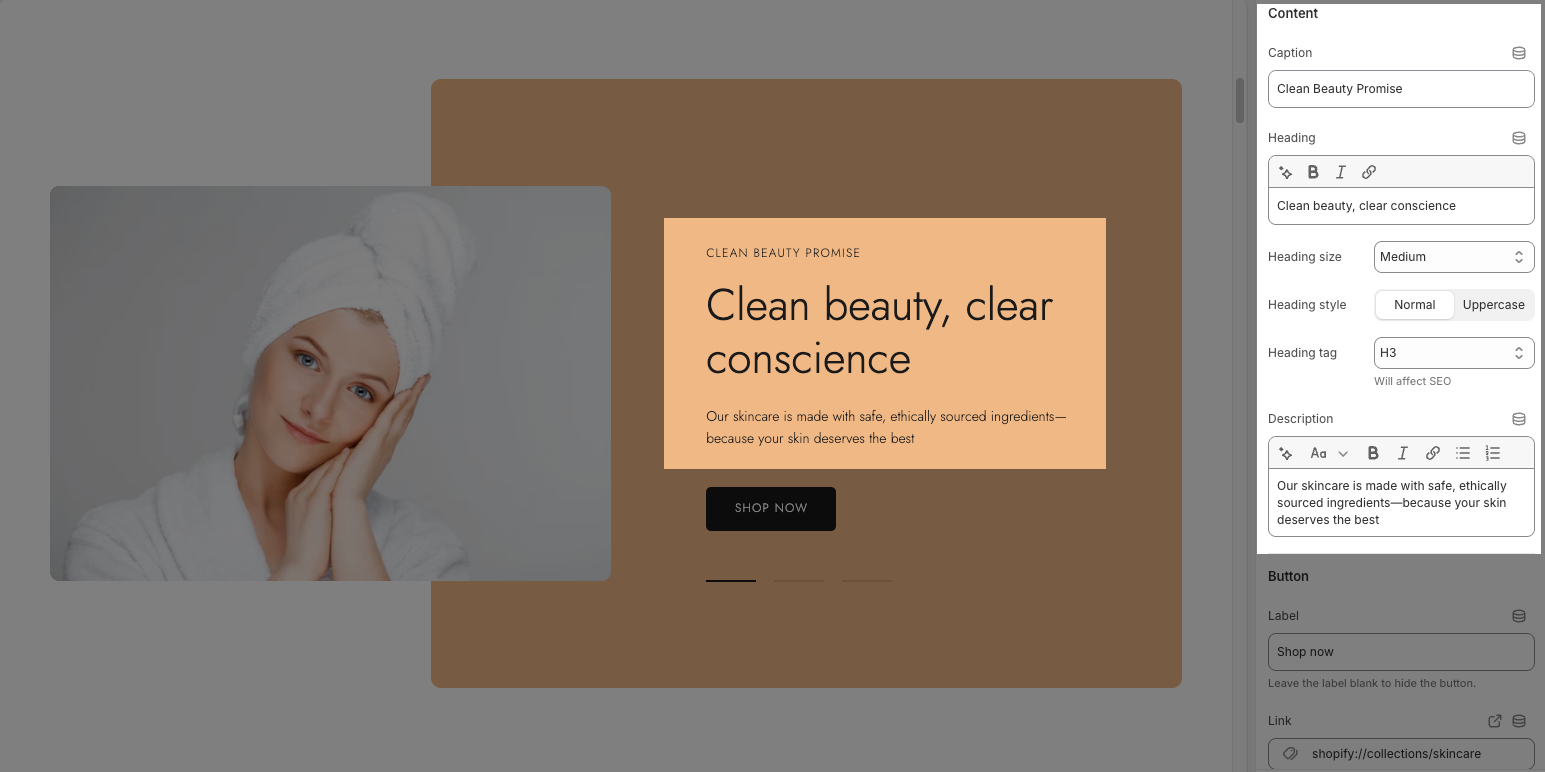 Description: A longer text area for adding more detailed content below the heading. Supports basic rich text formatting: font styling, links, bullet points, etc.
