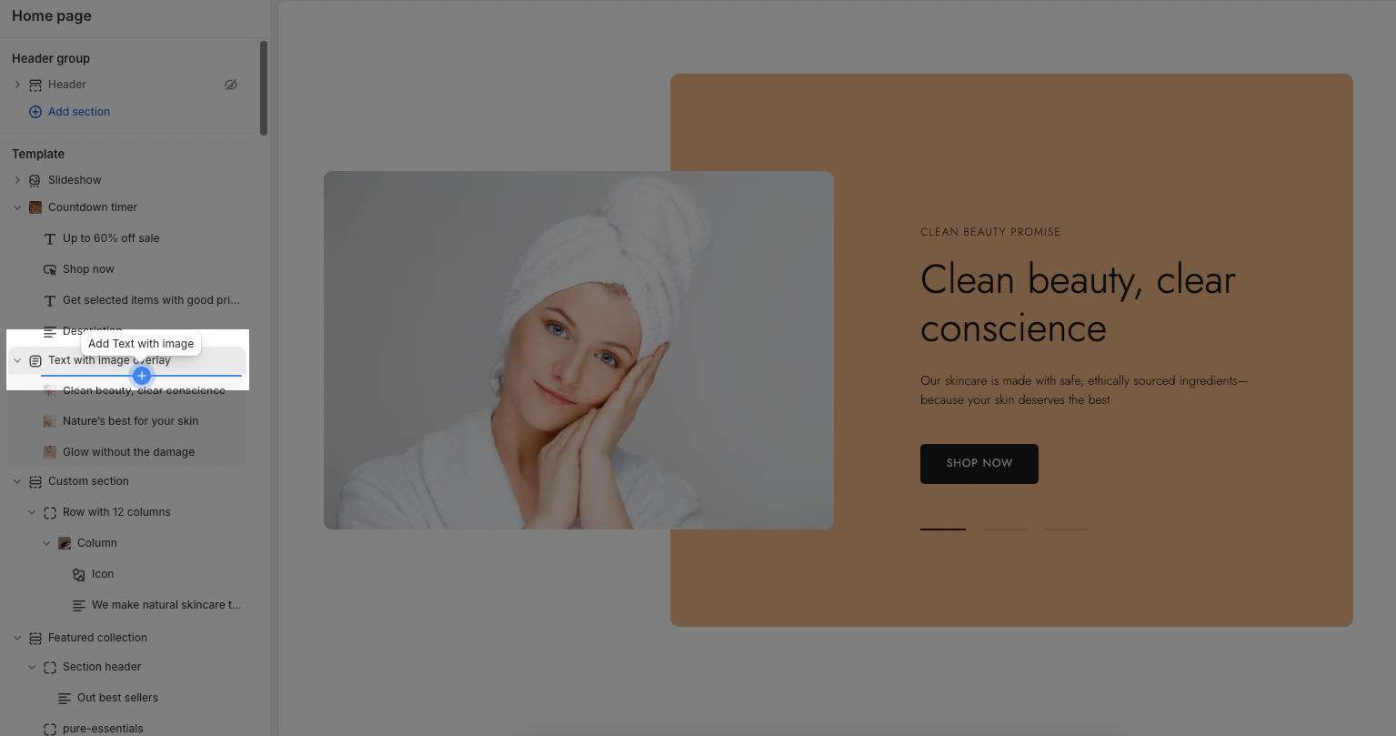 To add Text with image block, click the Add Text with image button (plus icon ➕) under the Text with image overlay section