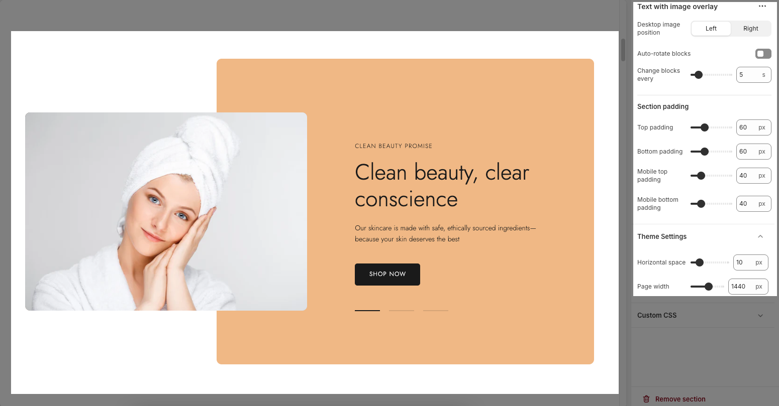The Text with image overlay section is a powerful way to highlight key messages or promotions by combining eye-catching visuals with compelling text. This section allows you to place text directly over an image background, creating a bold and engaging presentation.