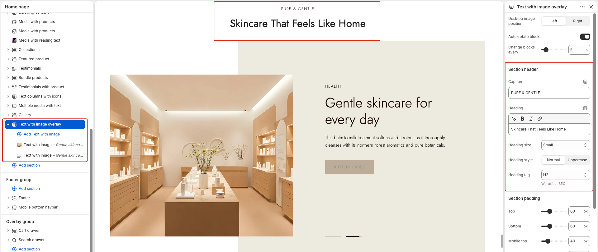 In this section, you'll learn how to customize the Text with image overlay section to match your campaign.