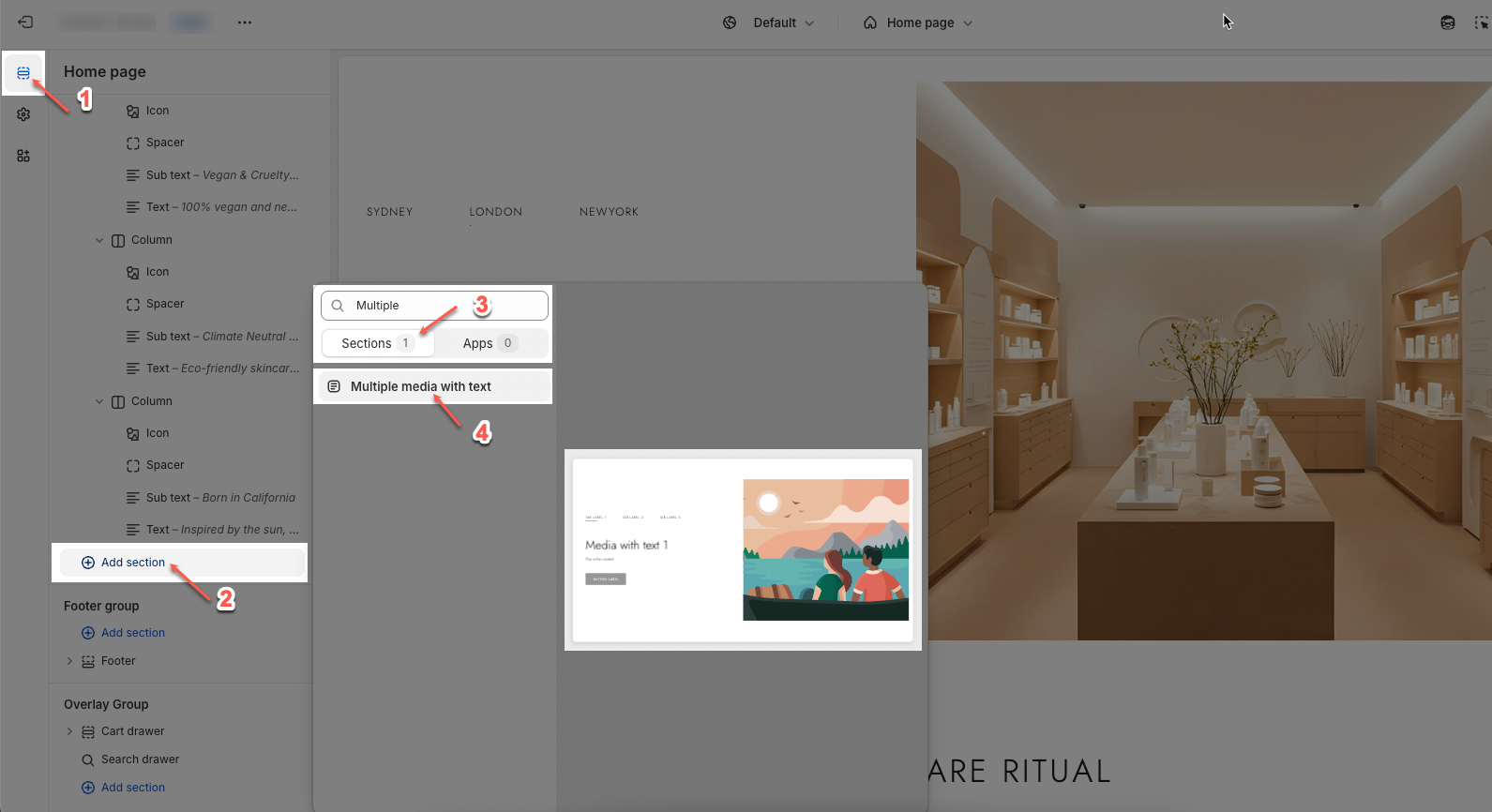 Step 2: In the theme editor (Customize), click the Sections button > Click the Add section button > In the Sections tab, scroll through the list or use the search bar to find and select Multiple media with text.
