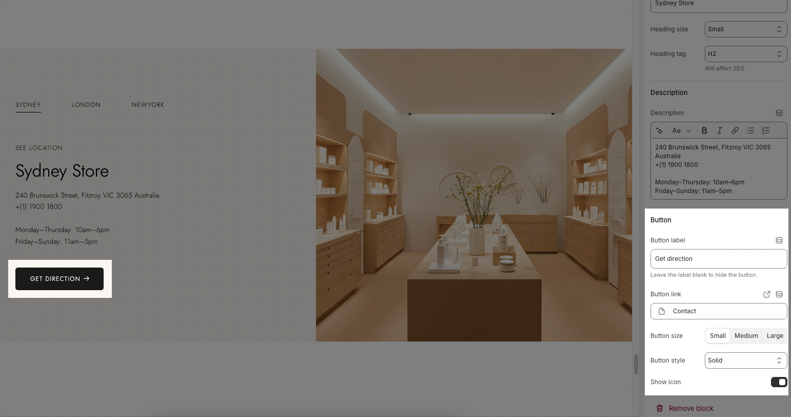Button link: Enter the URL or select a page/product to link the button to. When clicked, users will be directed to the specified destination.