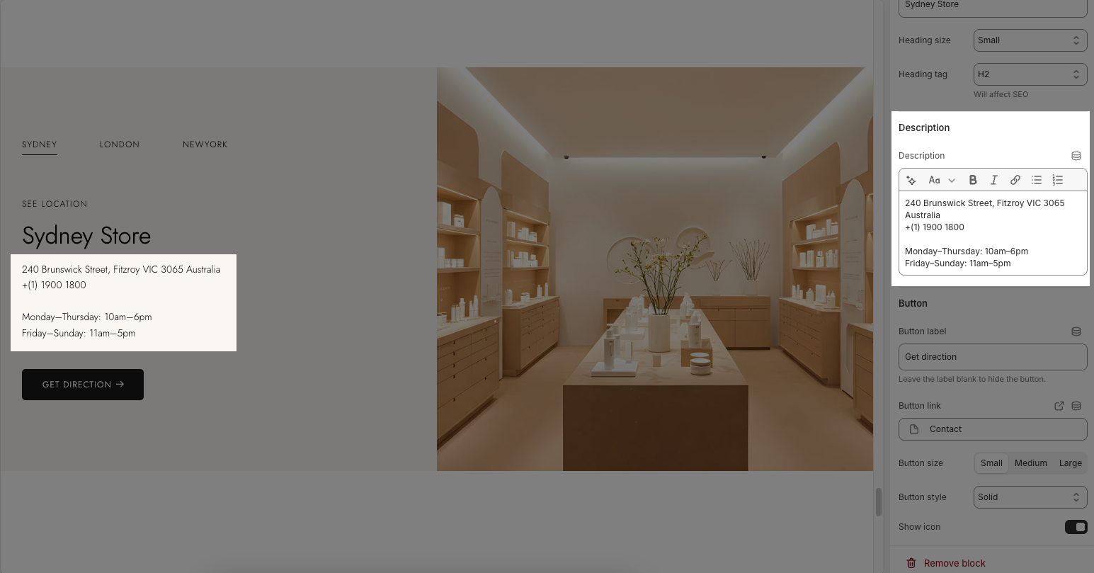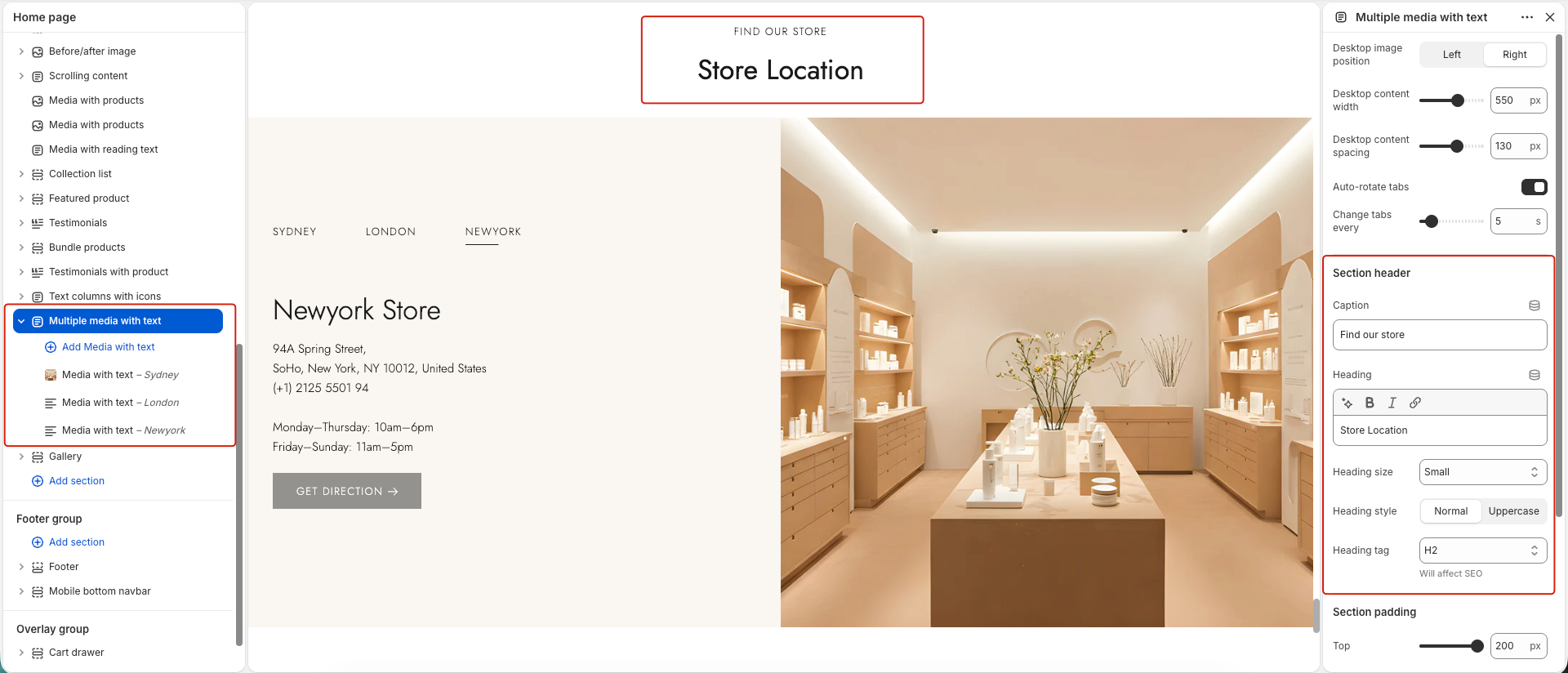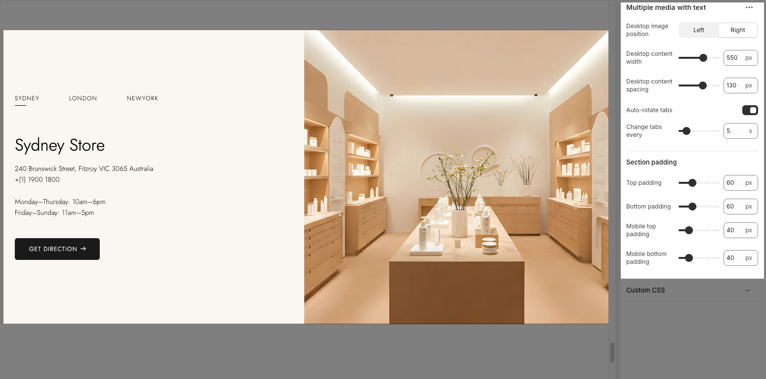 The Multiple media with text section is a versatile layout that allows you to showcase different content blocks with images and corresponding text side by side. It’s perfect for highlighting multiple store locations, product categories, or featured content in a visually organized way.