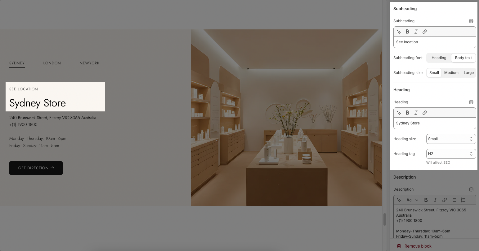 Heading tag: Sets the HTML tag of the heading, which does affect SEO. You can also change the Heading tag to: