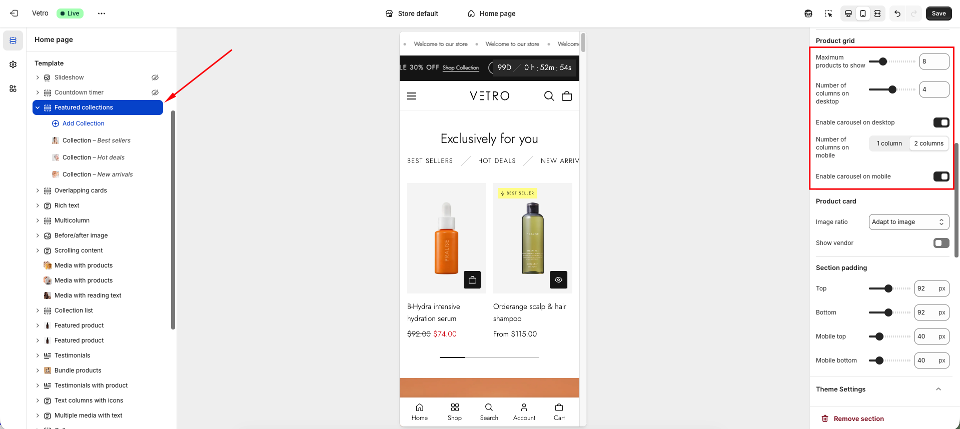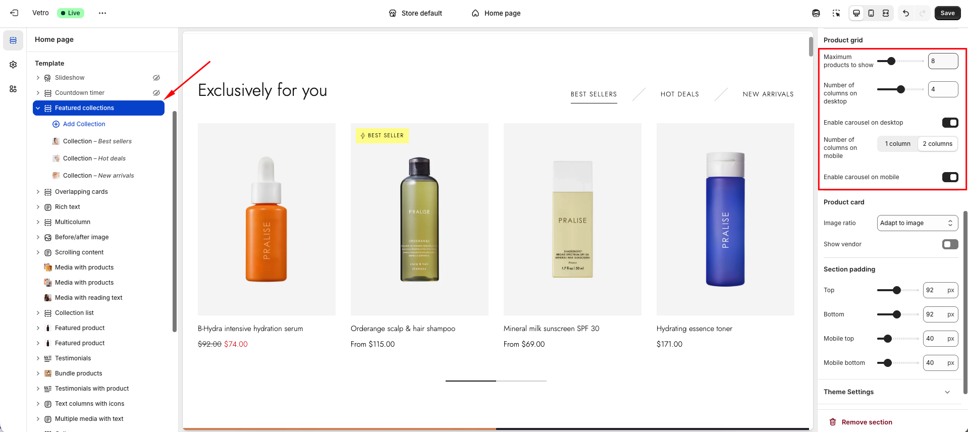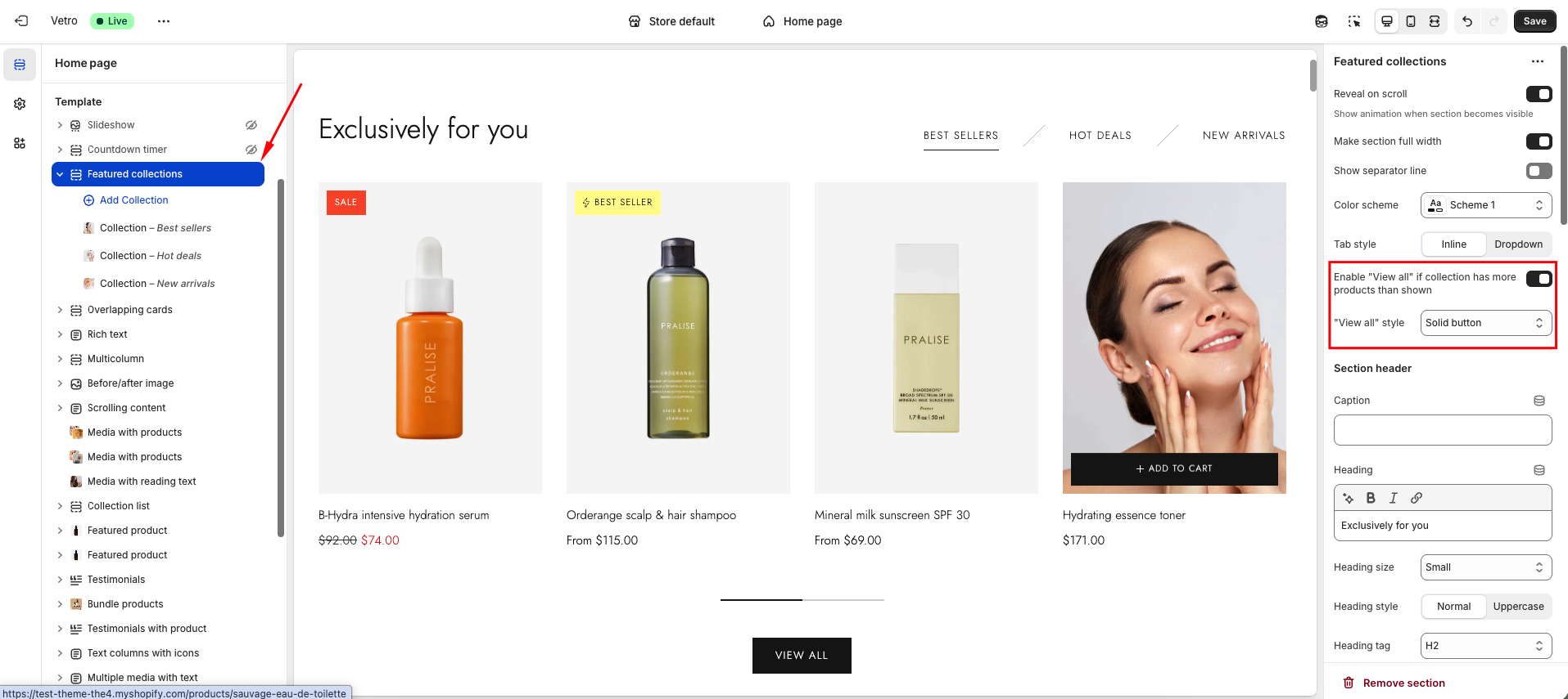 The Featured Collections section helps you highlight best sellers, new arrivals, or special collections in a clean, engaging layout. It makes it easy for customers to explore products and quickly find what they’re interested in.