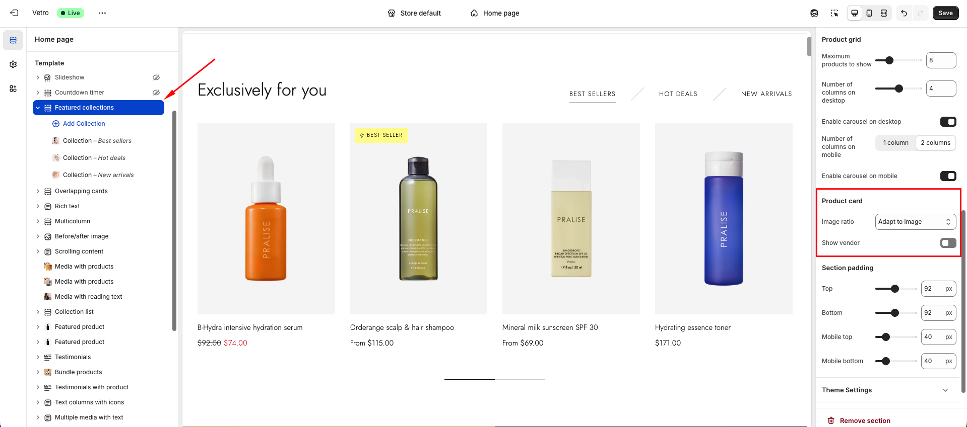 Image ratio: Adjust the aspect ratio of collection images, ensuring images display beautifully and proportionally (Adapt to image, Square, ASOS, Portrait, Landscape, Custom)