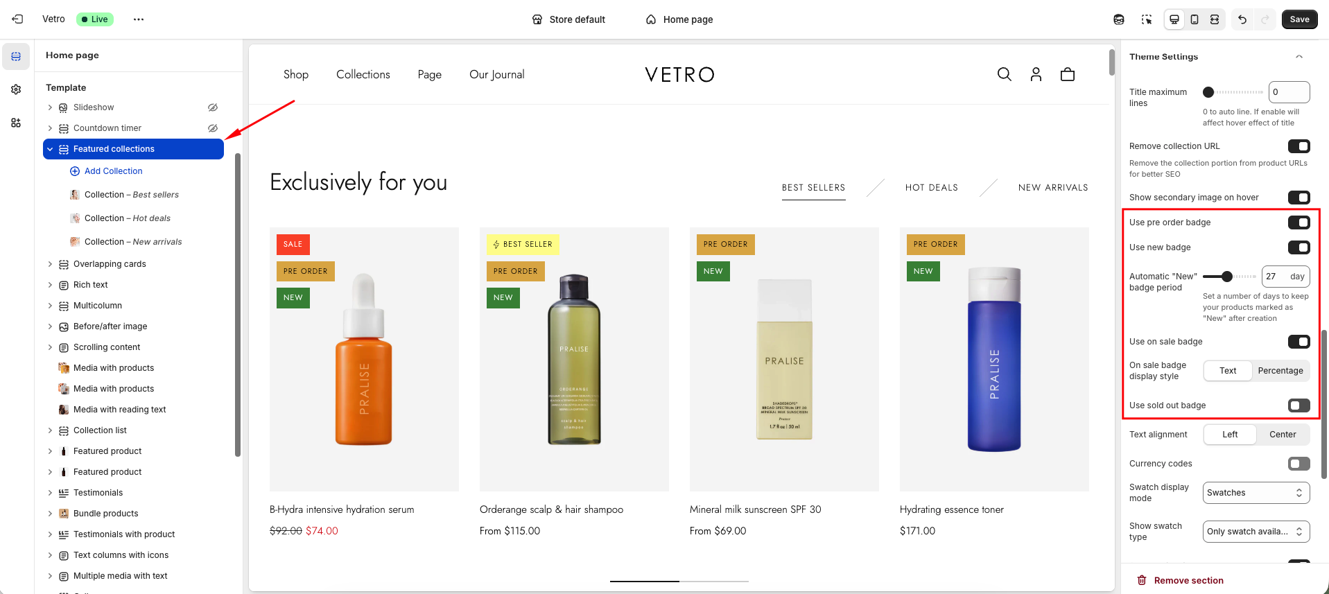 Tip: The New badge will show based on the product publish date + the time set in Automatic “New” badge period.