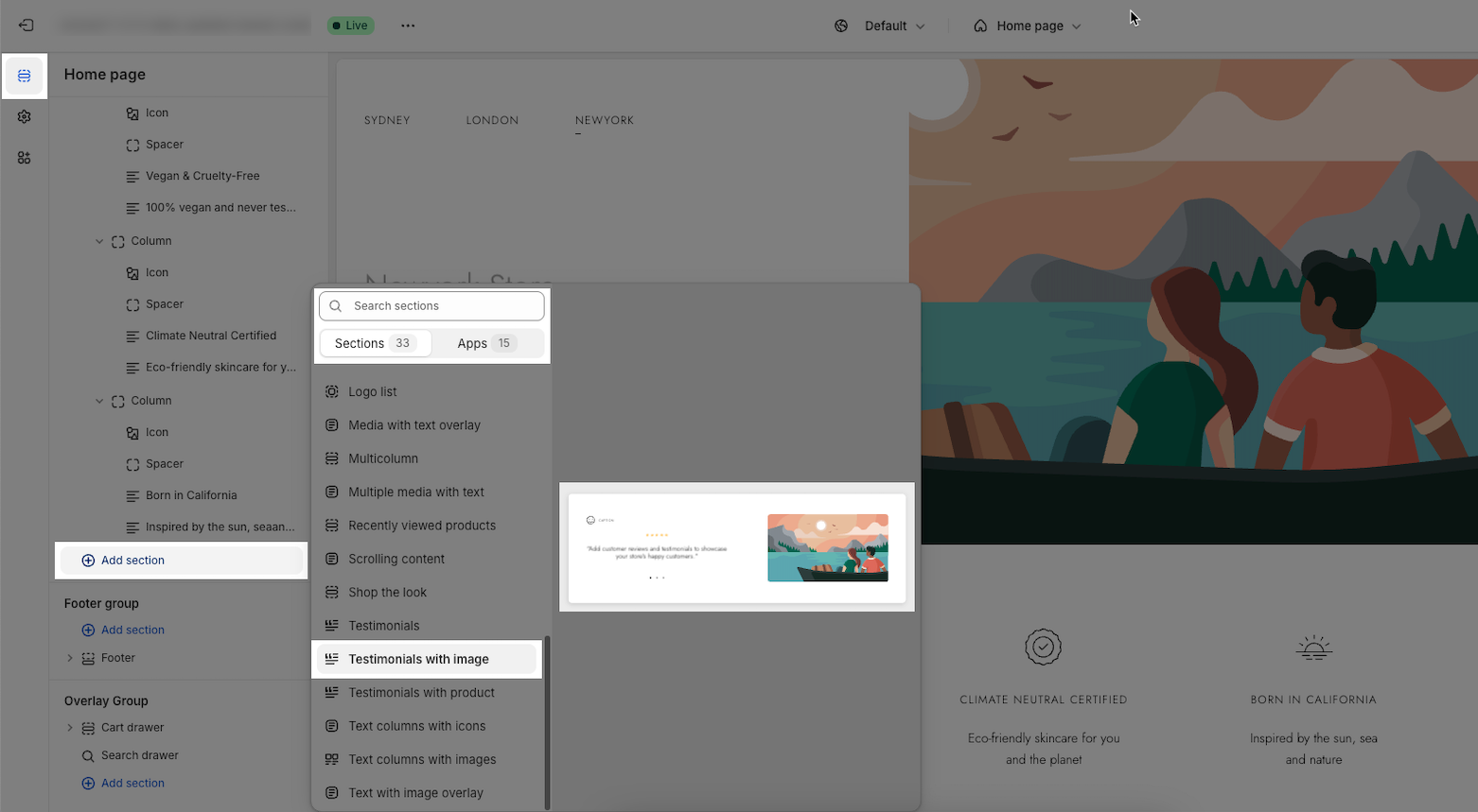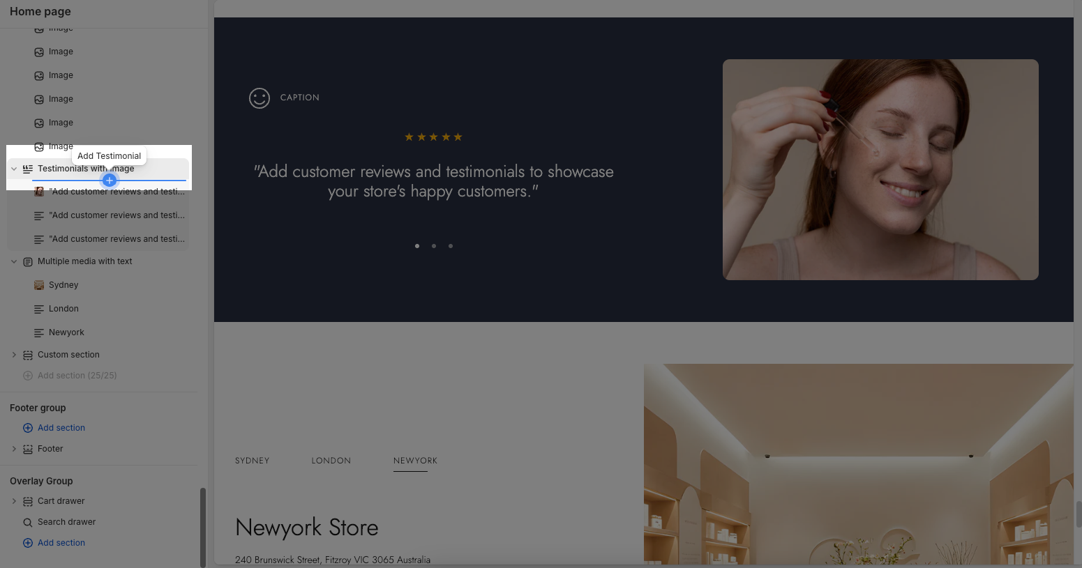 Step 02: In the theme editor (Customize), click the Sections button > Click the Add section button > In the Sections tab, scroll through the list or use the search bar to find and select Testimonials with Image.