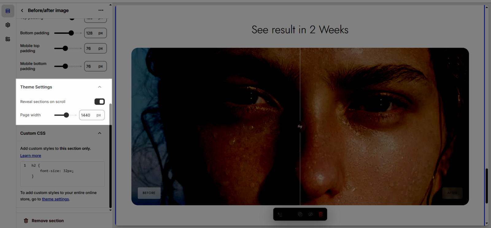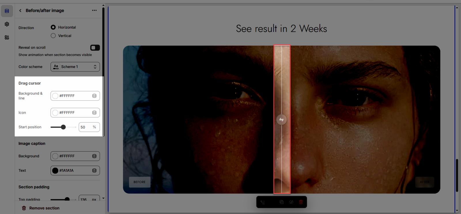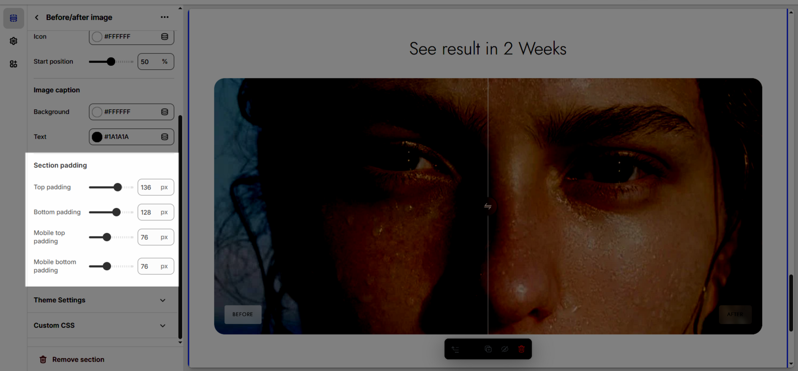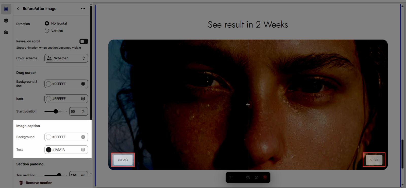 Clicking on the Section header title under Before/After image section, you can customize that section's settings in the left or right sidebar (depending on your screen size)