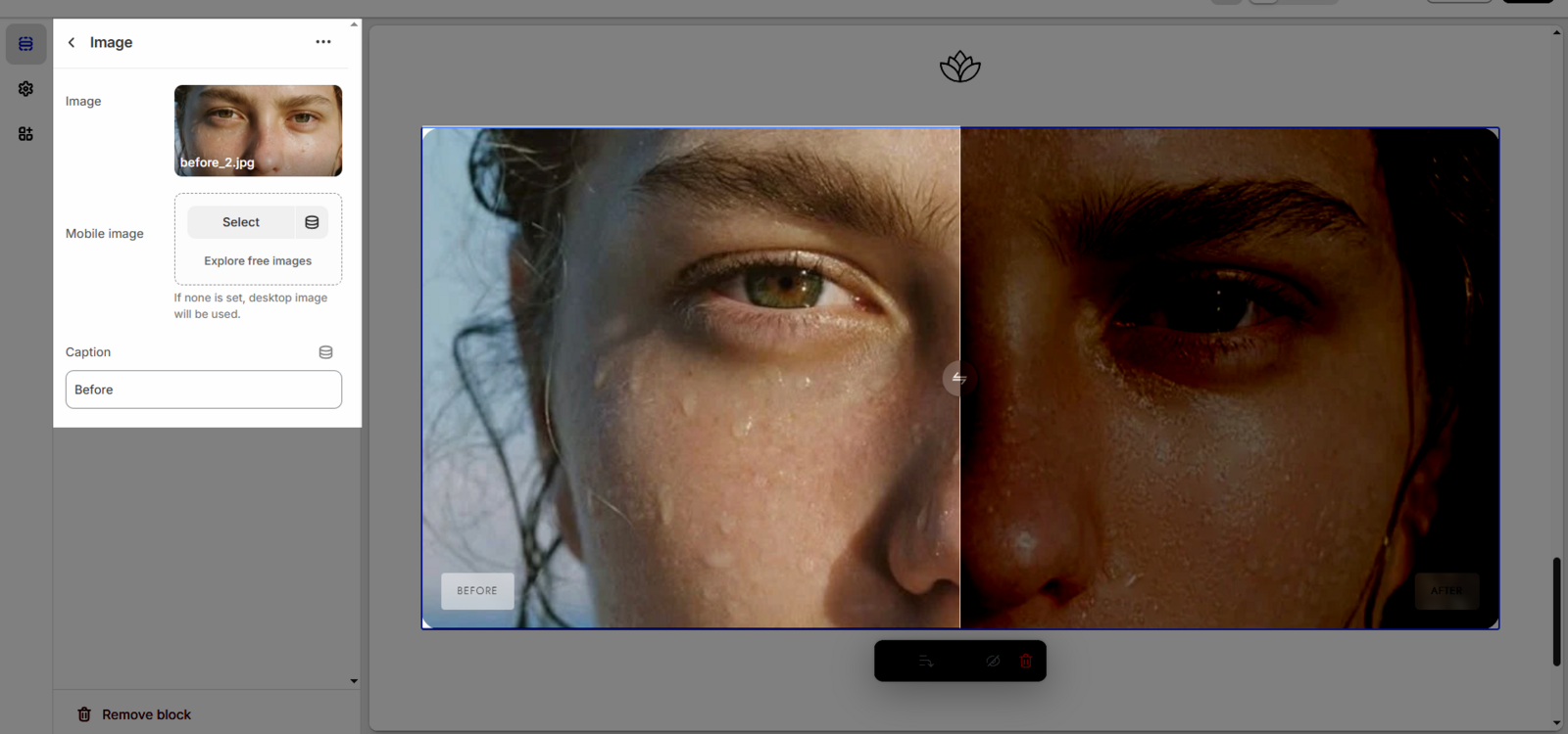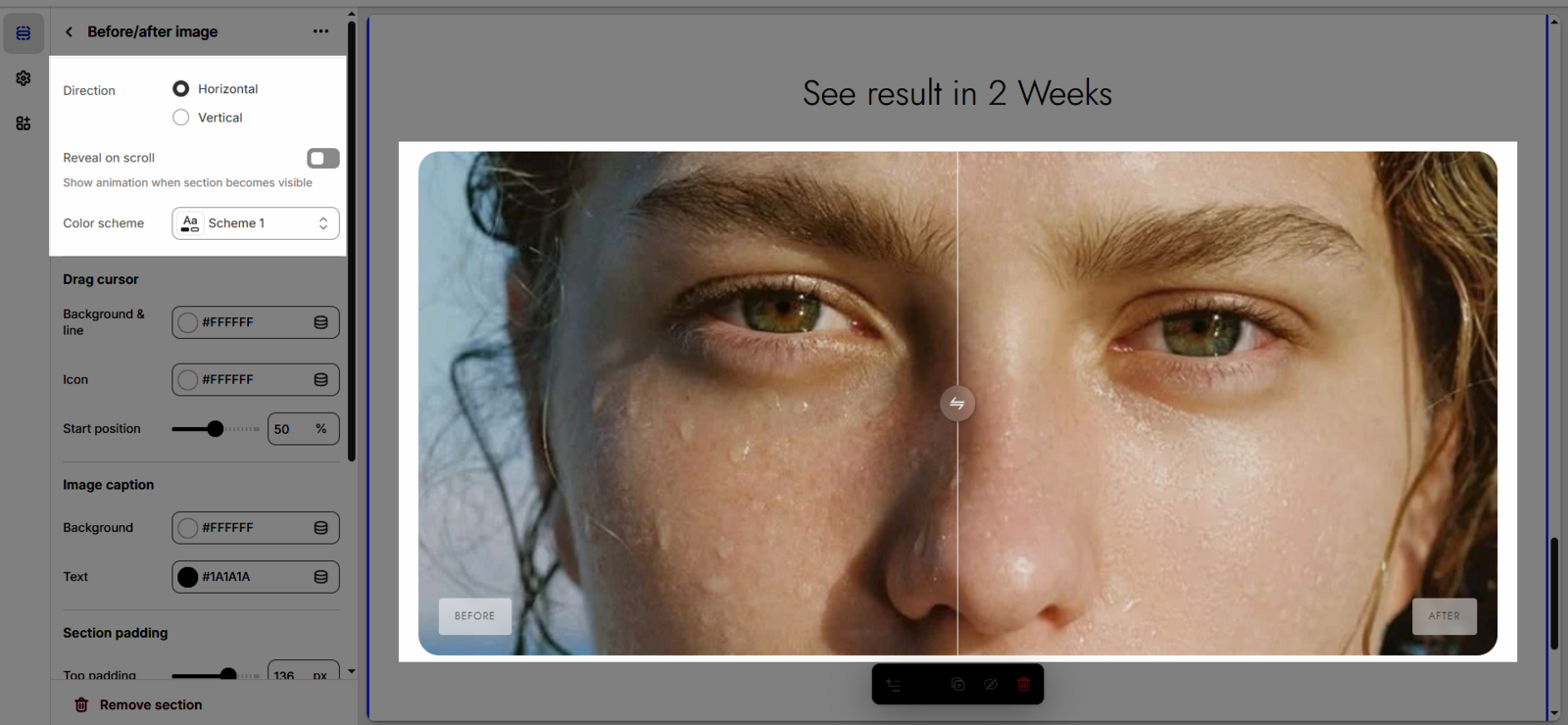 Once you add the Before/After image section, you can customize its settings in the left or right sidebar (depending on your screen size)
