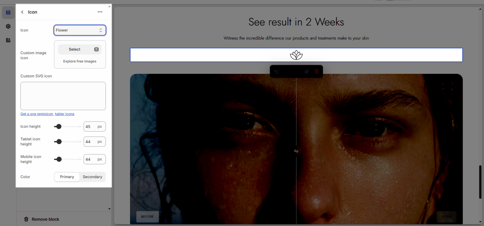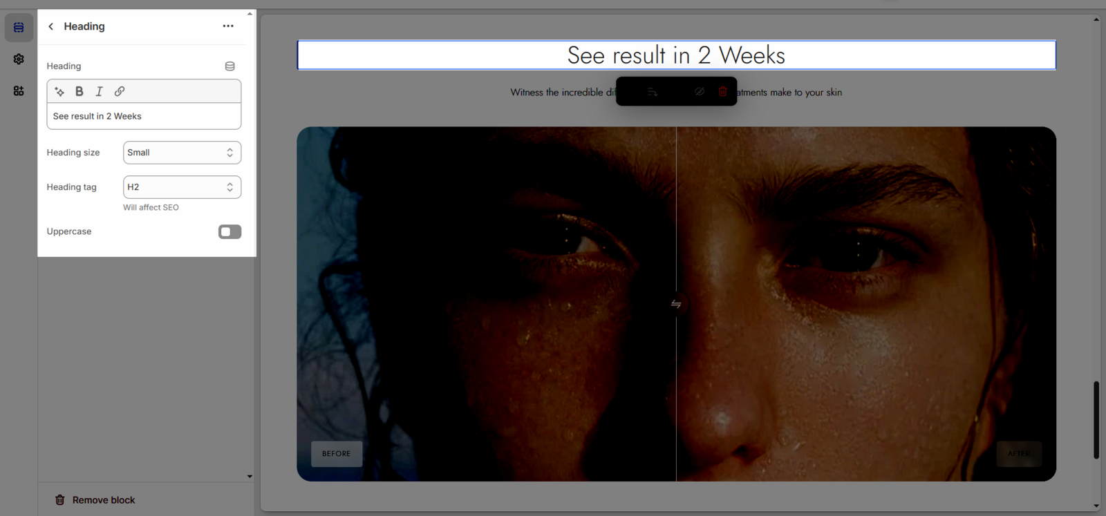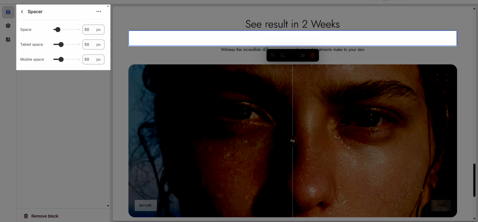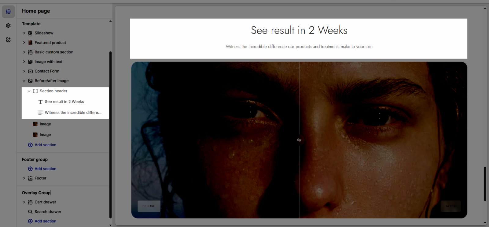 The ' Before/After image section' is a powerful and visual way to demonstrate the effectiveness of your products or services. By displaying clear comparison images, you can easily show customers the difference and significant improvements. This is a great tool for building trust and convincing customers of the real value you provide.