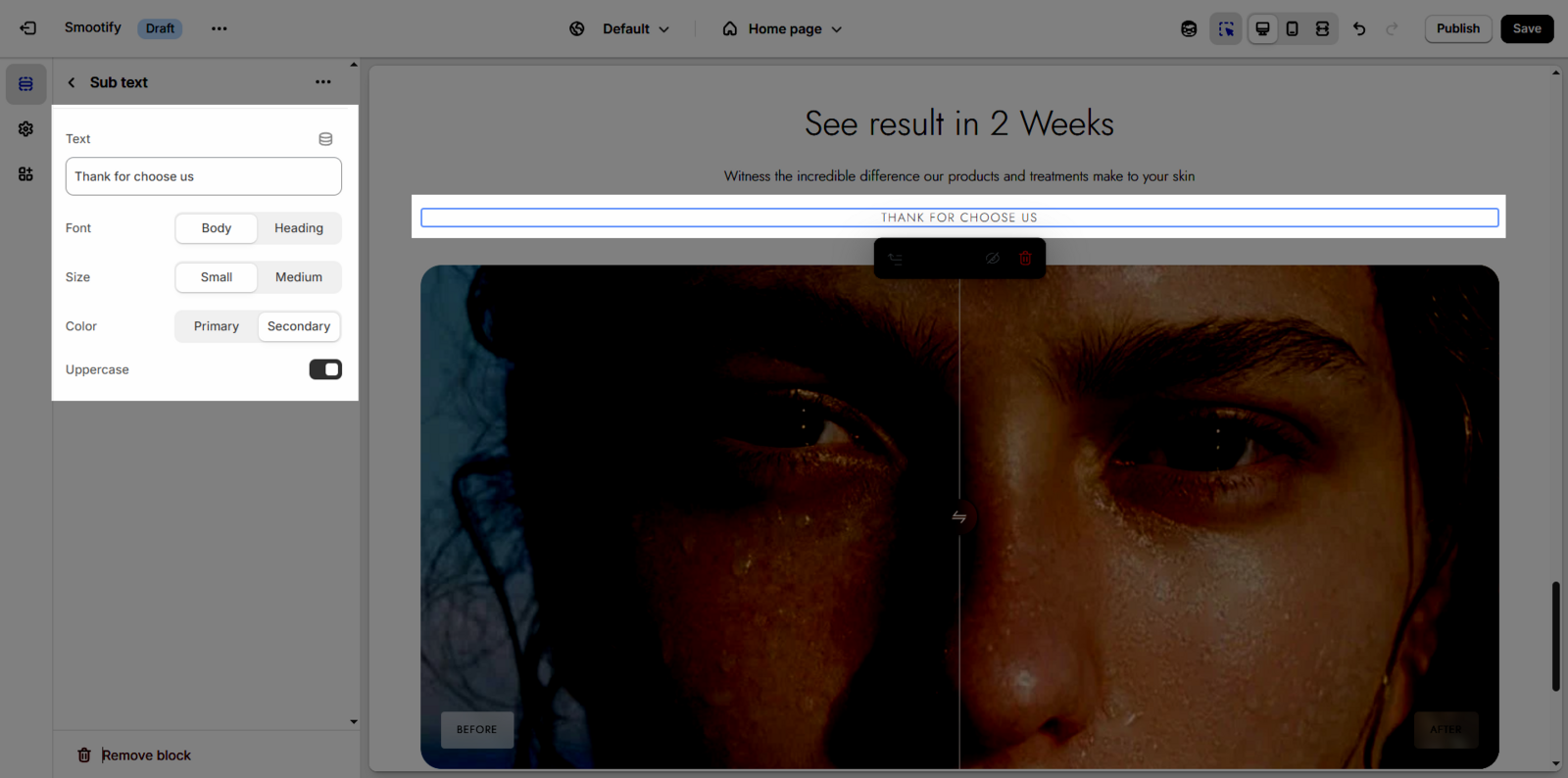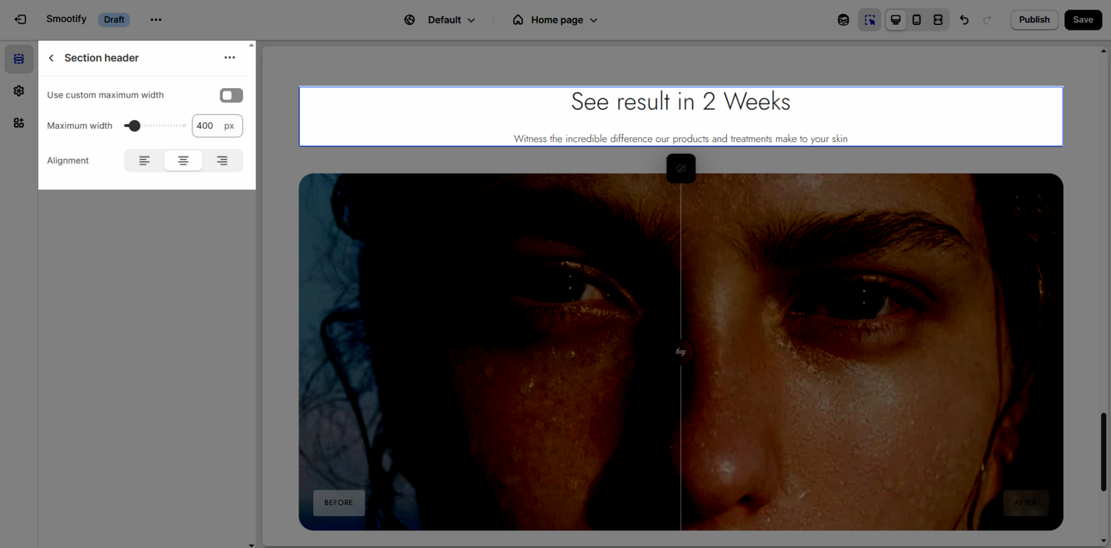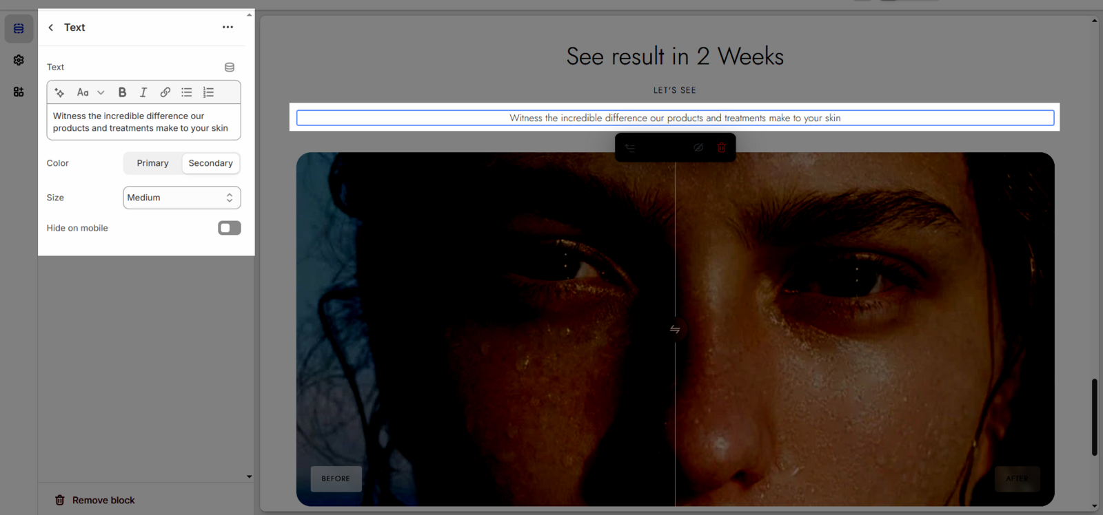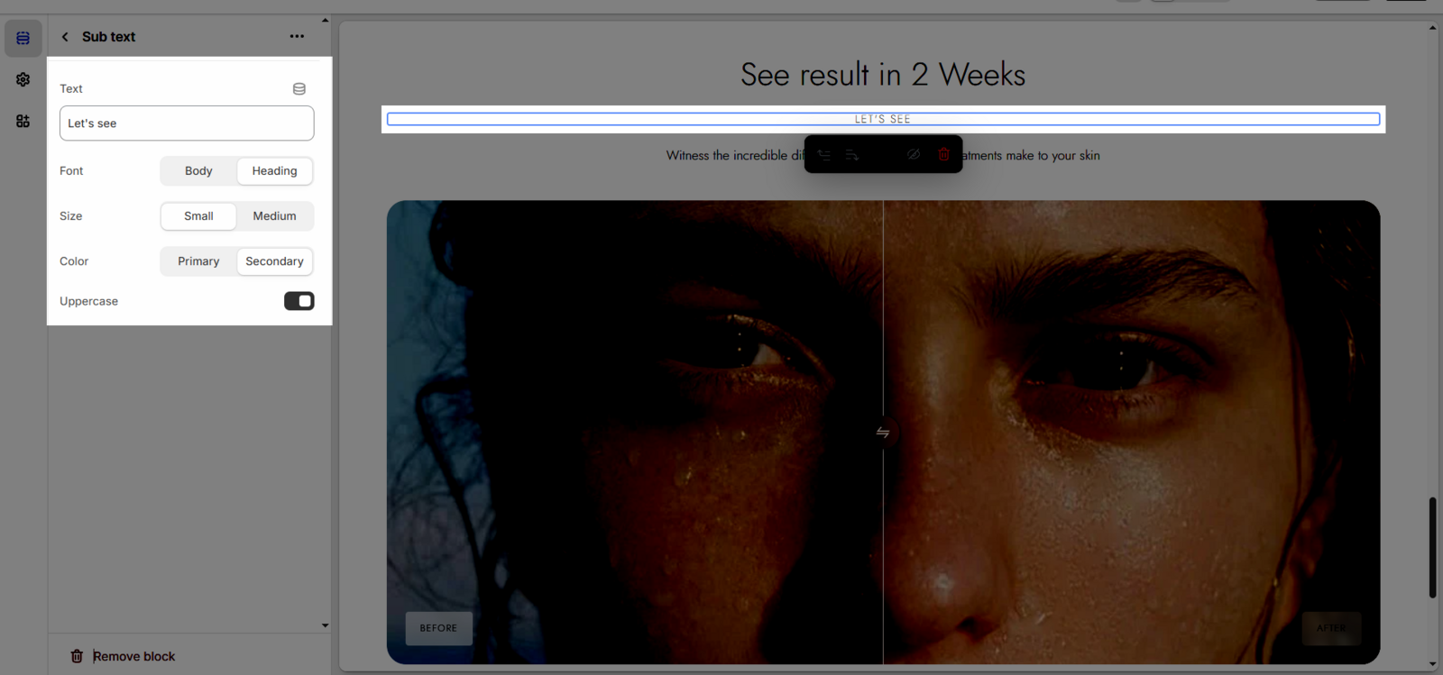 The ' Before/After image section' is a powerful and visual way to demonstrate the effectiveness of your products or services. By displaying clear comparison images, you can easily show customers the difference and significant improvements. This is a great tool for building trust and convincing customers of the real value you provide.