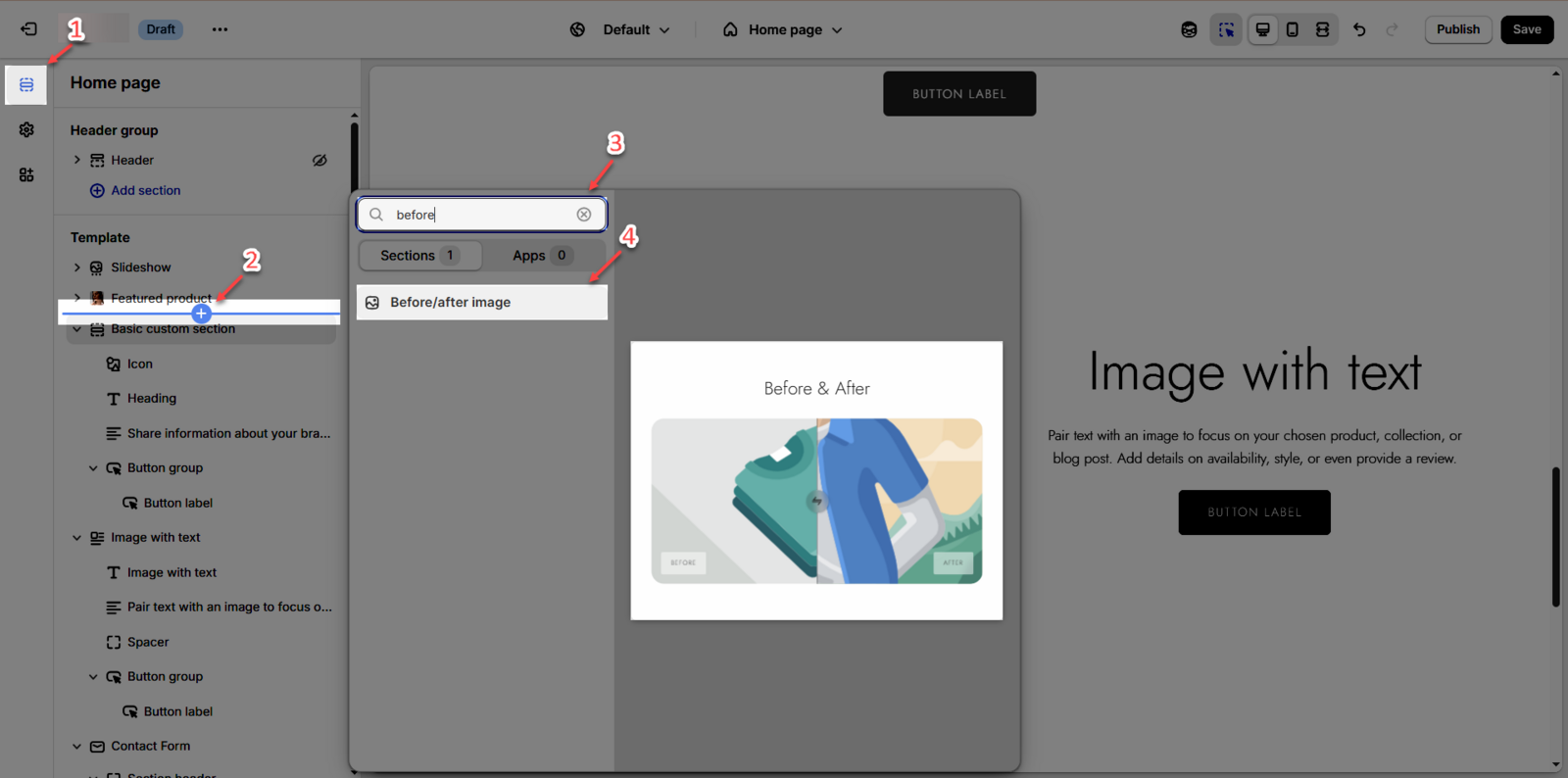 Step 02: In the theme editor (Customize), click the Sections button > Click the Add Section button or hover below another section until the (➕) icon appears > In the Sections tab, scroll through the list or use the search bar to find and select Before/After image section