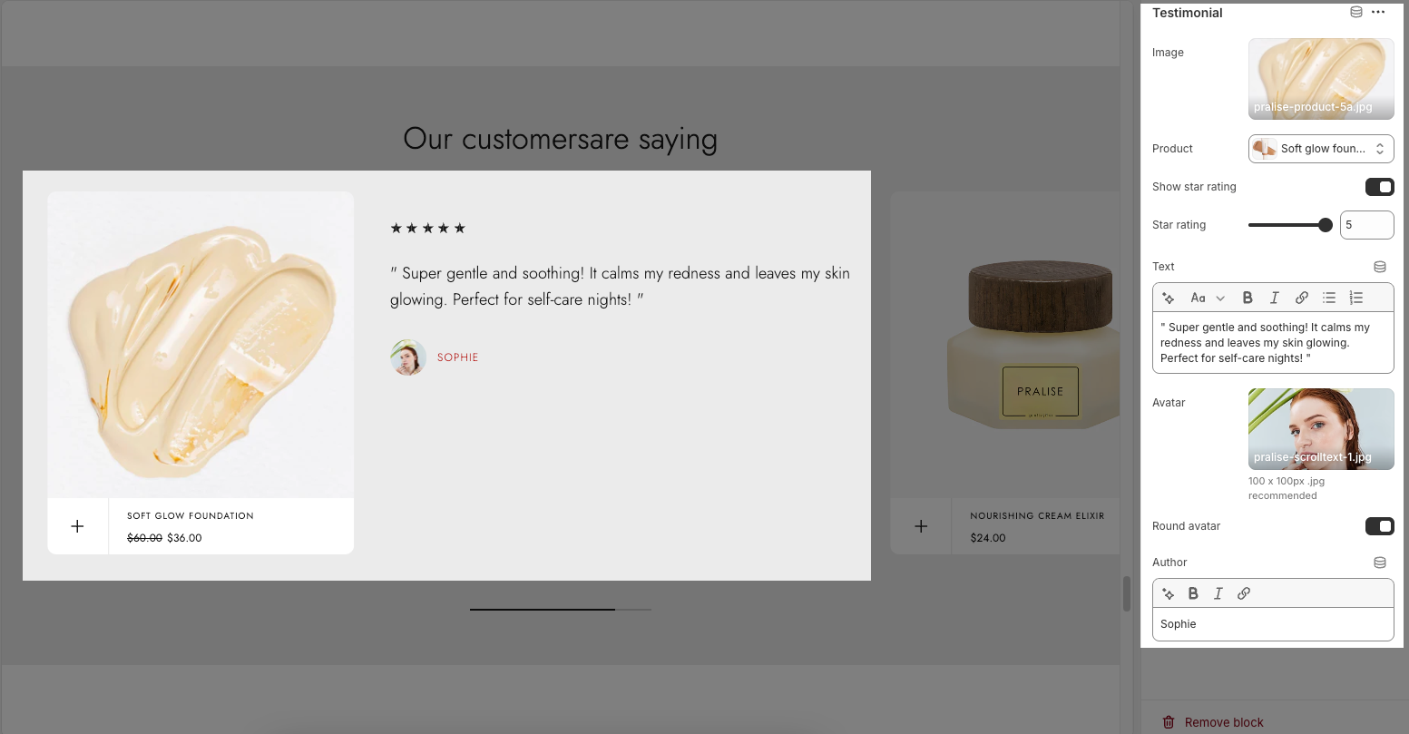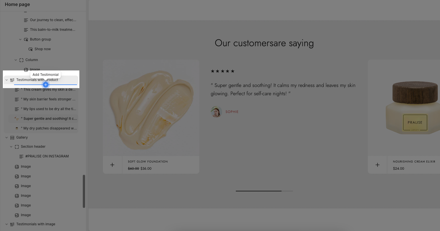 To add a Testimonial block, click the Add Testimonial button (plus icon ➕) under the Testimonials with product section.