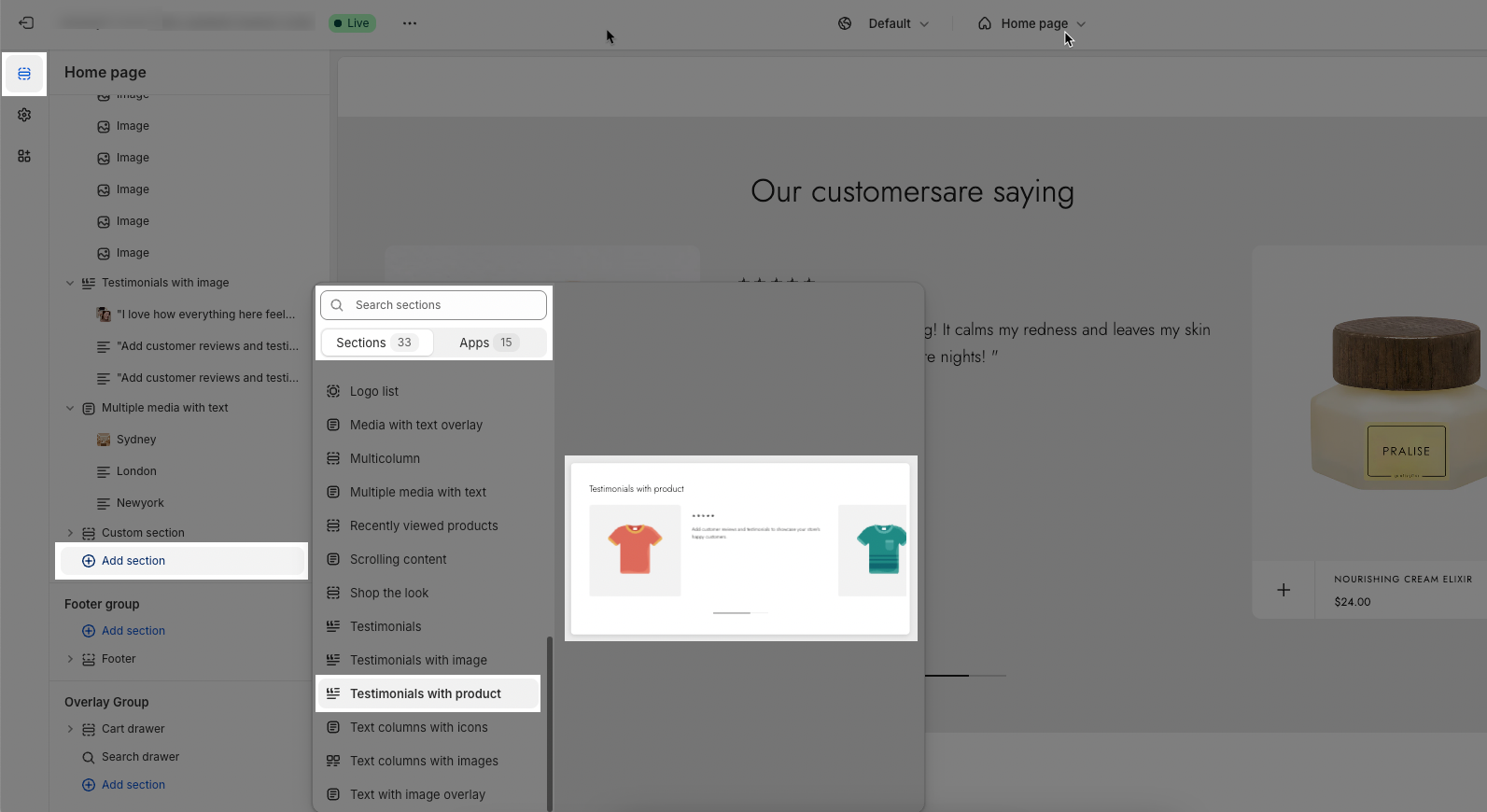 Step 02: In the theme editor (Customize), click the Sections button > Click the Add section button > In the Sections tab, scroll through the list or use the search bar to find and select Testimonials with product.