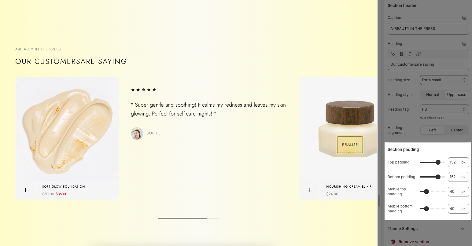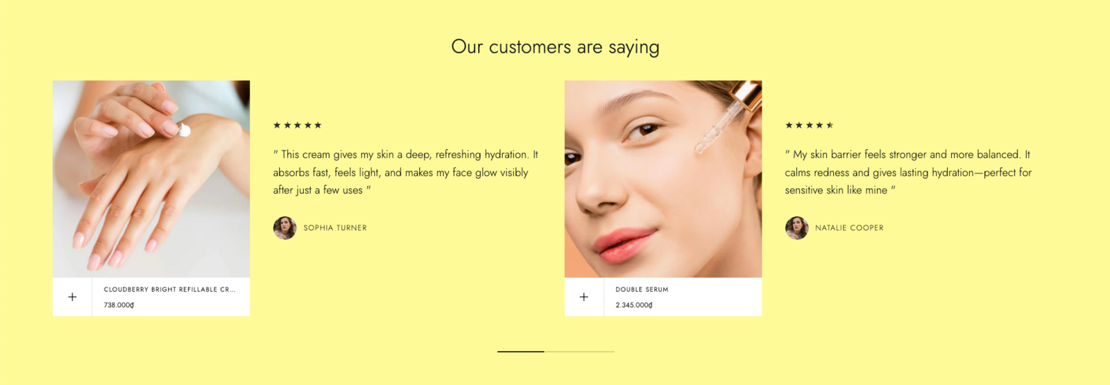 The Testimonials with product section is a powerful way to build trust by showcasing real customer feedback alongside featured products. This layout helps highlight both social proof and specific items you want to promote.