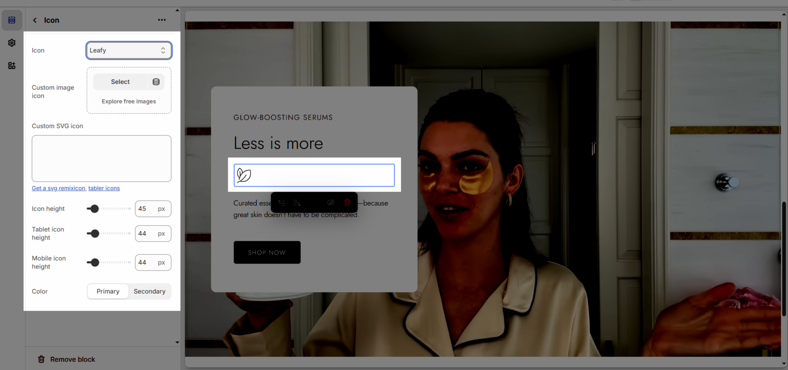 Once the Icon block is added, you can customize its settings in the left or right-hand sidebar (depending on your screen size)