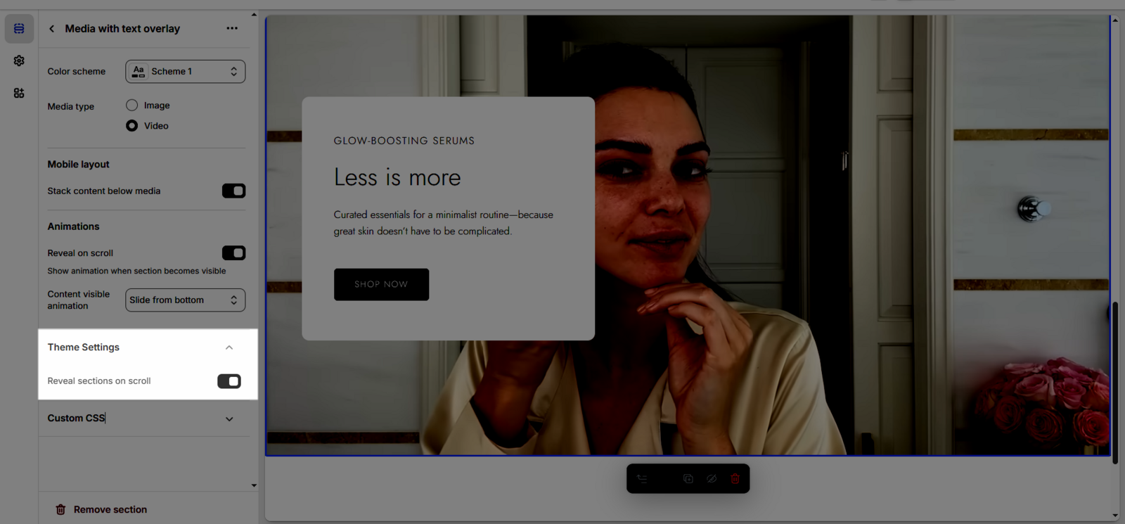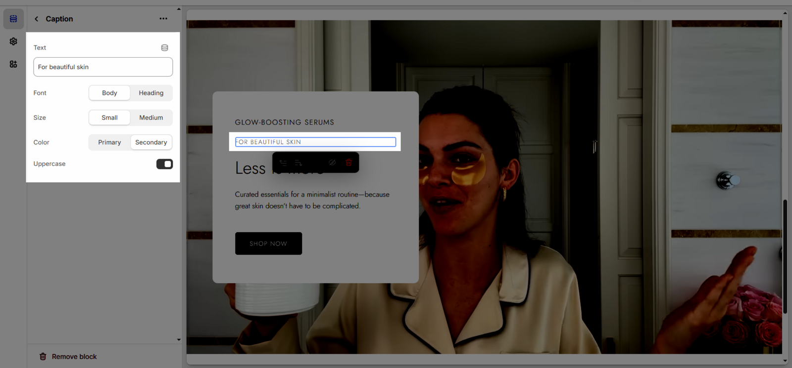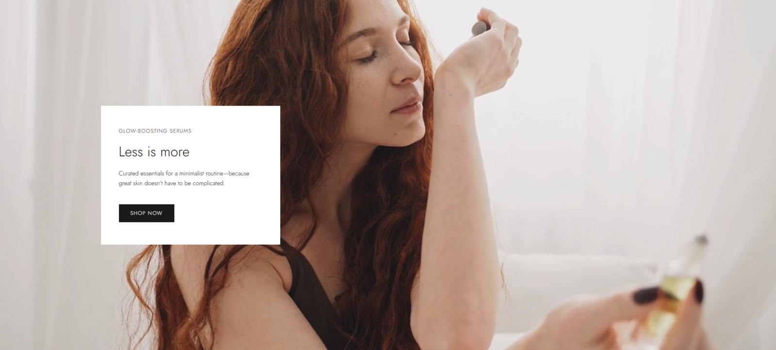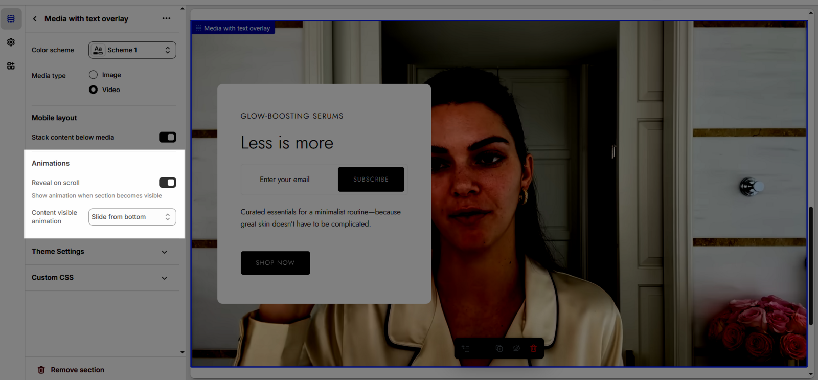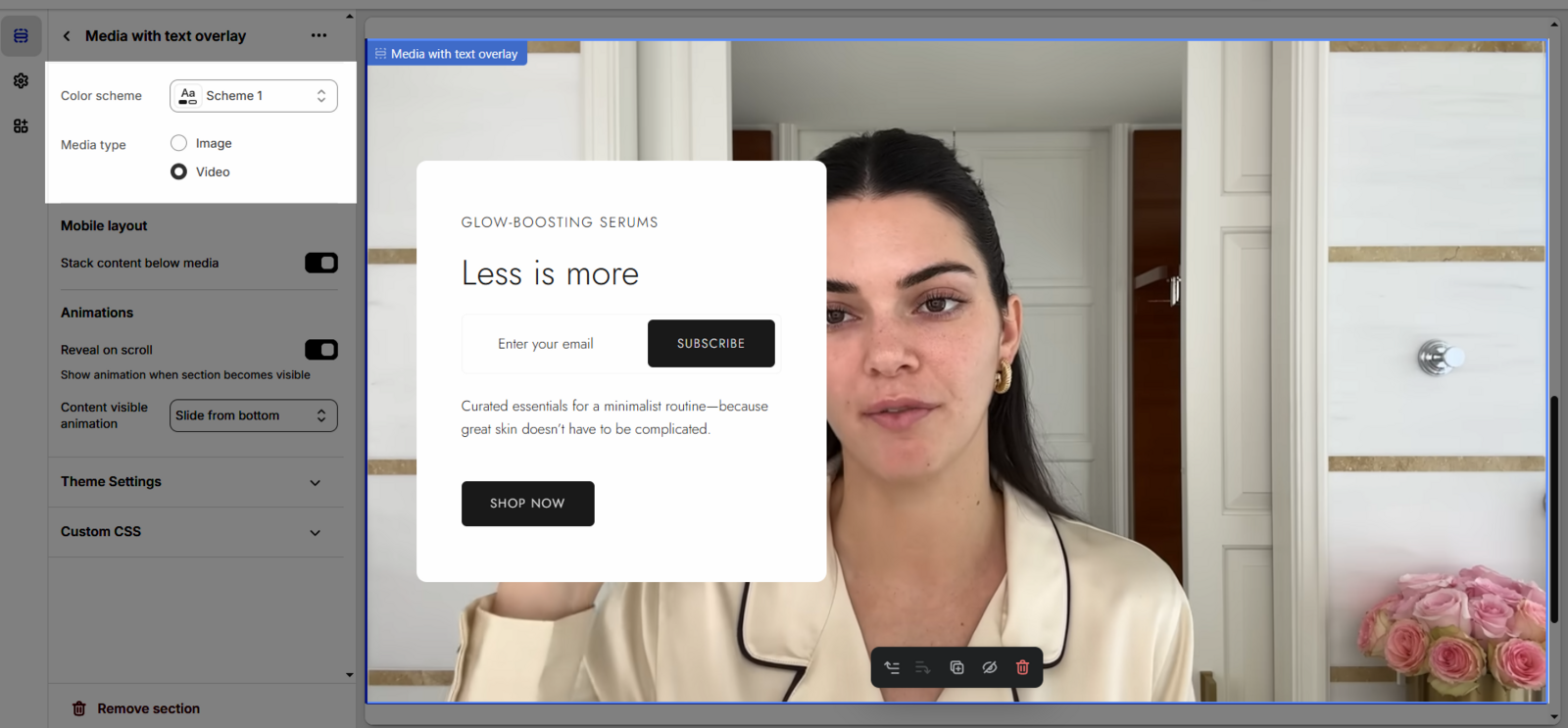 The Media with text overlay section is a great way to grab your customers' attention right away. Combining a striking image or video with bold text, you can convey your key message, showcase a featured product or tell your brand story in a powerful, visual way. It's an ideal tool for making a great first impression and leading customers to explore further.