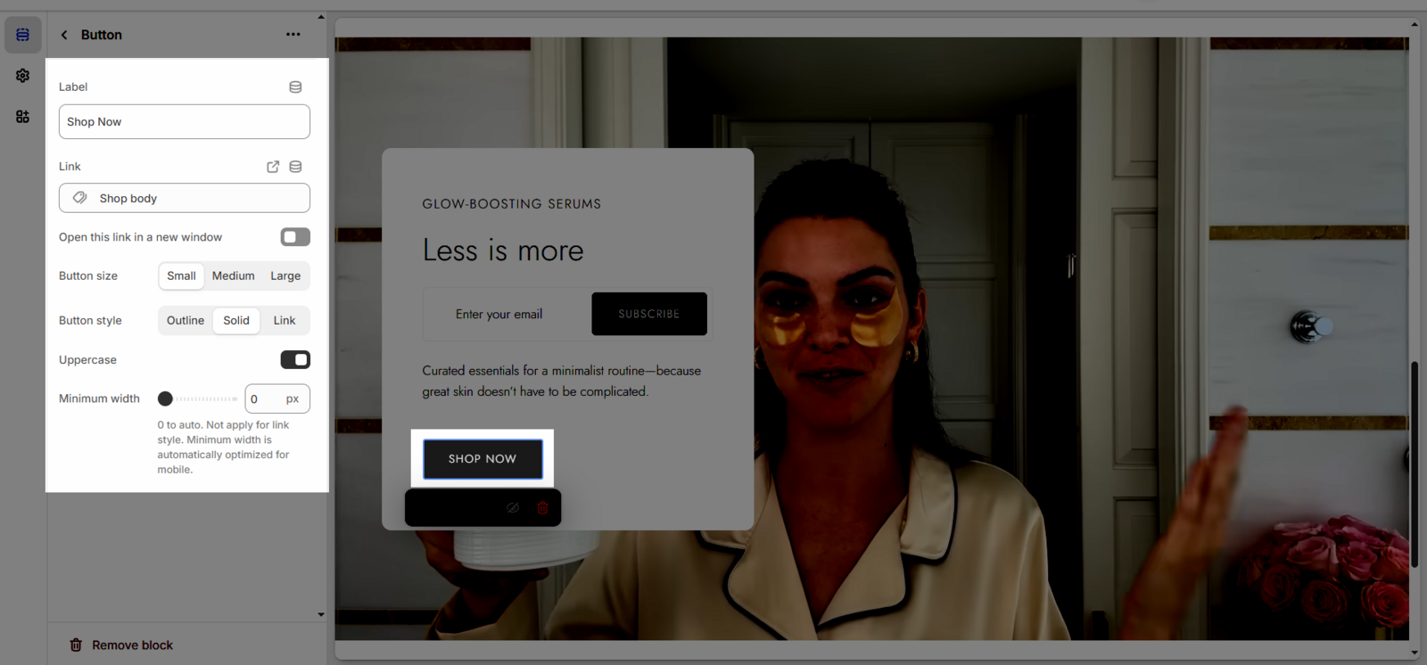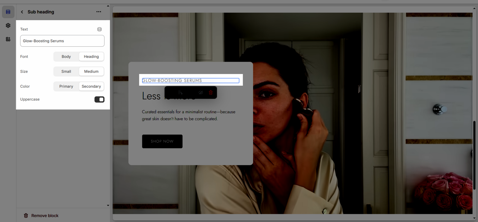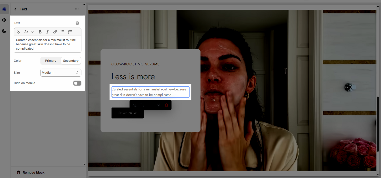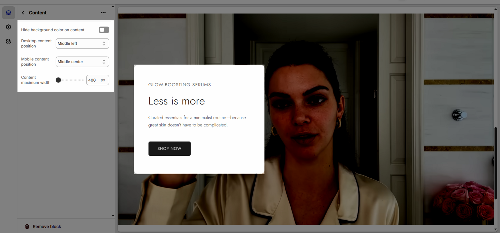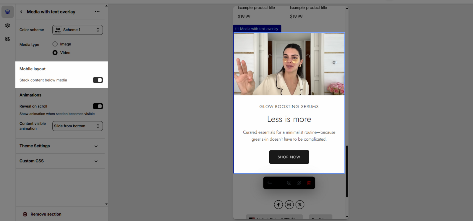 The Media with text overlay section is a great way to grab your customers' attention right away. Combining a striking image or video with bold text, you can convey your key message, showcase a featured product or tell your brand story in a powerful, visual way. It's an ideal tool for making a great first impression and leading customers to explore further.