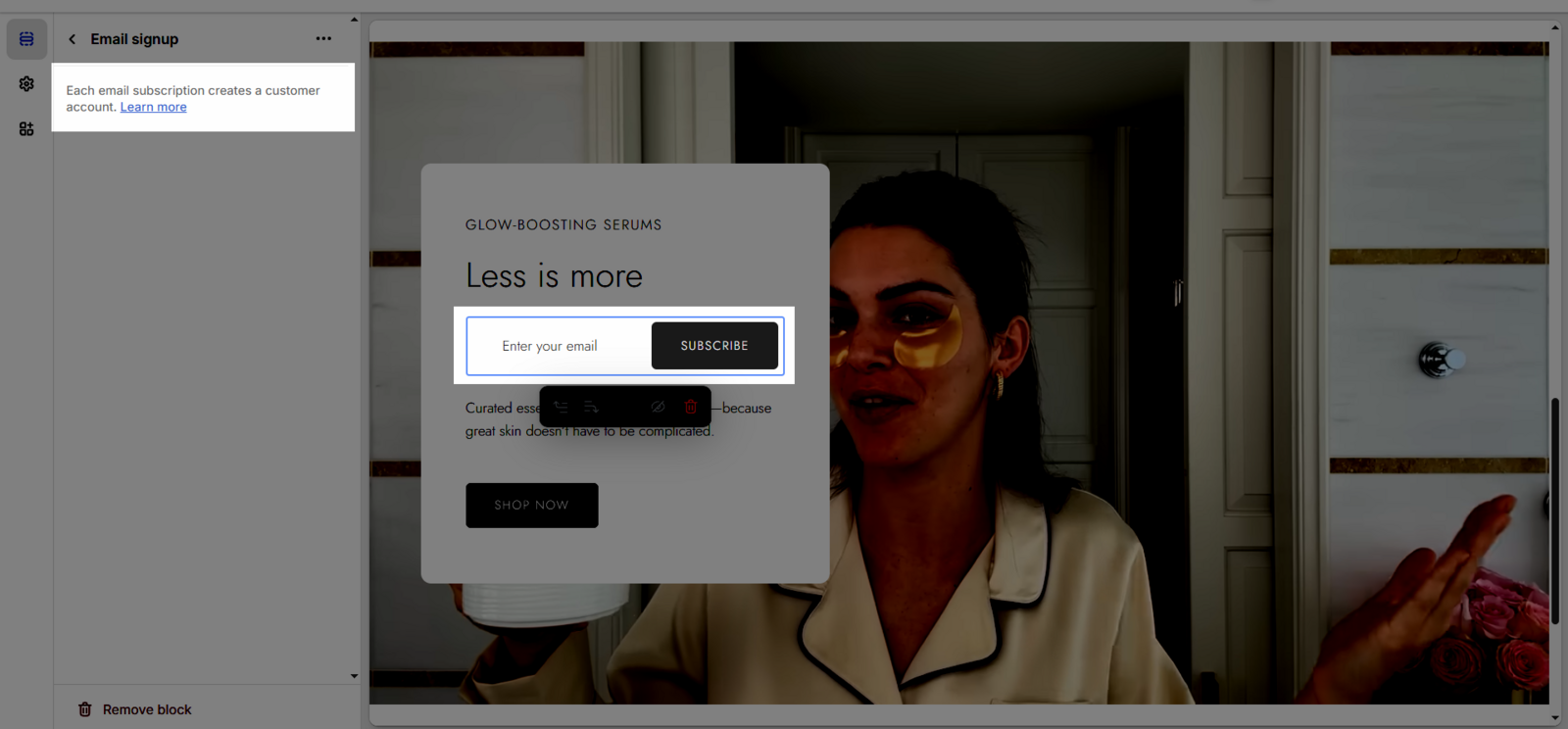 Once the Email signup block is added, you can customize its settings in the left or right-hand sidebar (depending on your screen size)