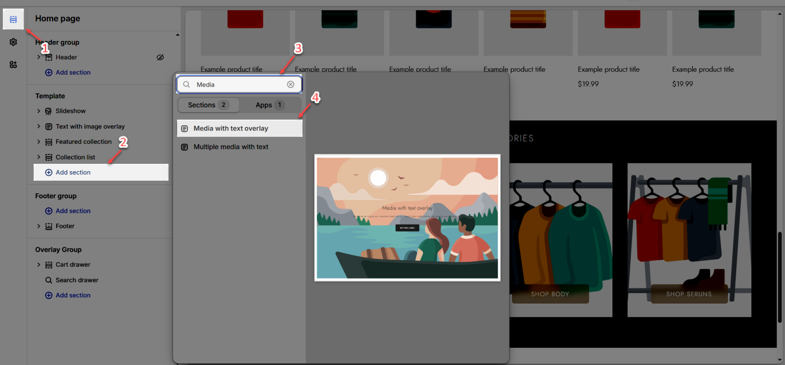 Step 02: In the theme editor (Customize), click the Sections button > Click the Add Section button or hover below another section until the (➕) icon appears > In the Sections tab, scroll through the list or use the search bar to find and select Media with text overlay