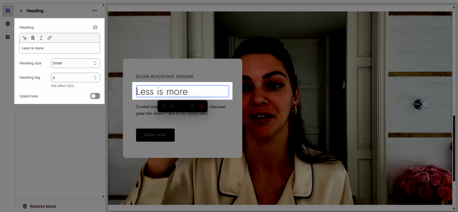 Heading tag (Will affect SEO): Select the HTML tag for the heading (eg: H1, H2, H3), affecting SEO structure and content hierarchy.