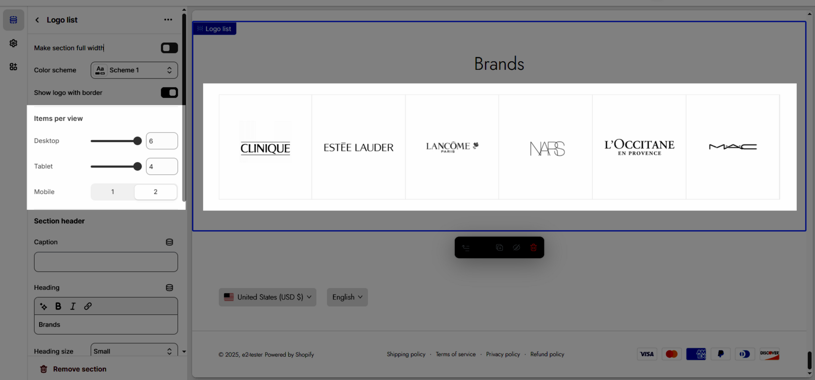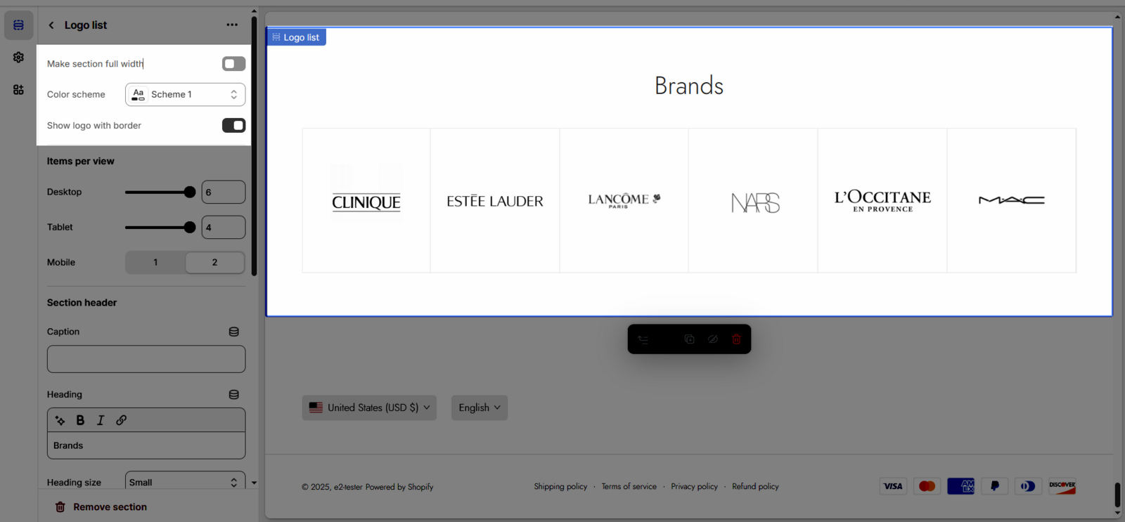 The Logo list section is a dedicated area to display the logos of your partners, suppliers, brands you work with, or certifications you have achieved. This is an effective way to build trust, increase credibility, and show customers your association with other reputable organizations.