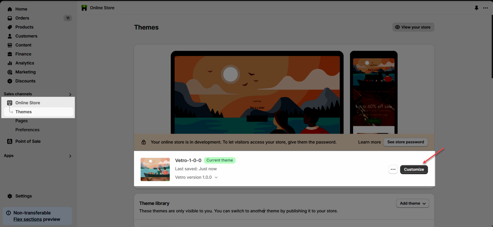 Step 01: From Shopify Admin, click on Online Store > Select Theme > In the Current theme section, click the Customize button.