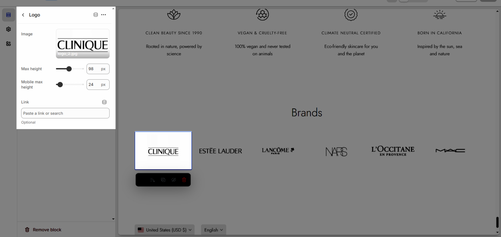 Once the Logo item is added, you can customize its settings in the left or right-hand sidebar (depending on your screen size)