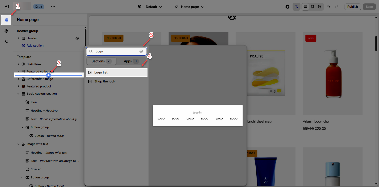 Step 02: In the theme editor ( Customize), click the Sections button > Click the Add Section button or hover below another section until the (➕) icon appears > In the Sections tab, scroll through the list or use the search bar to find and select Logo list