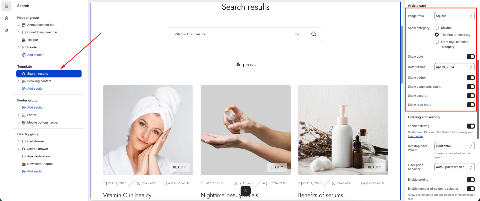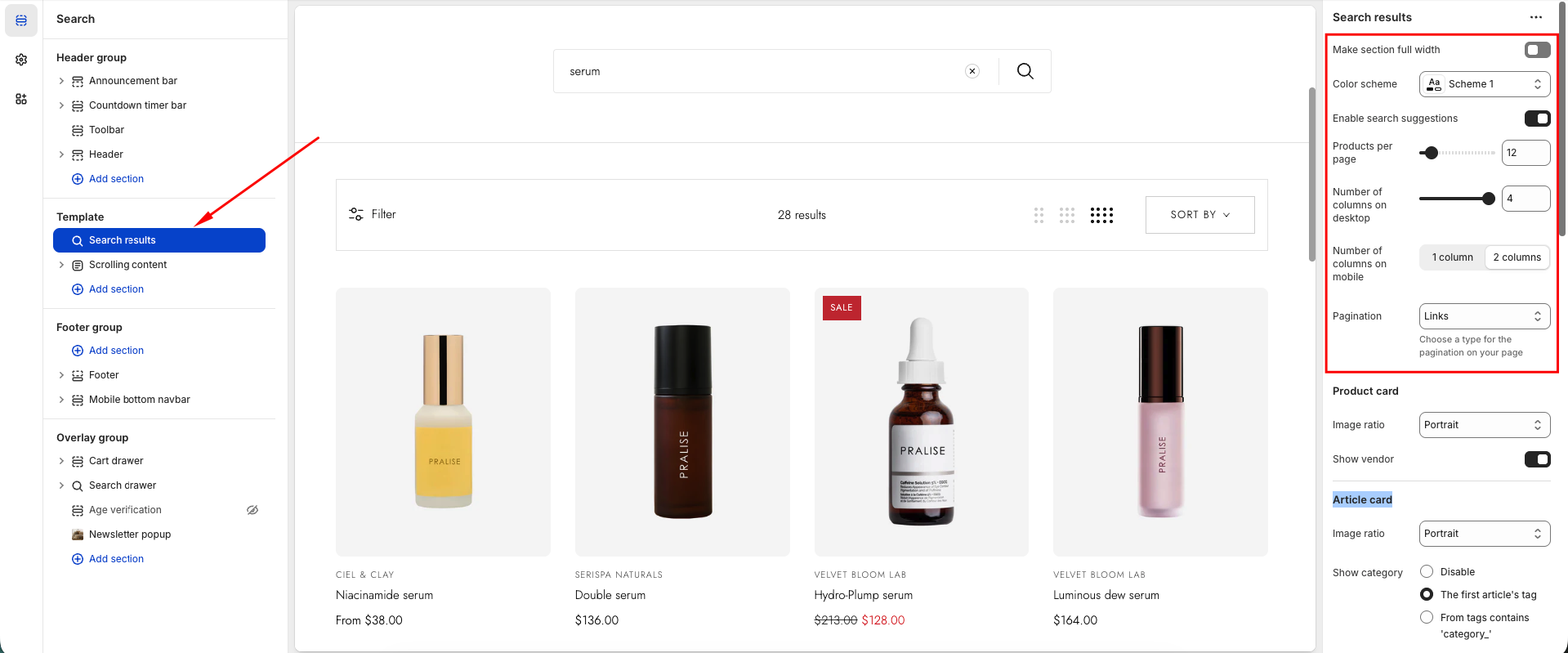 Search Page helps customers quickly find products, articles, and pages that match their search terms. By customizing the Search results section, you can improve usability, highlight key content, and better match your store’s design.