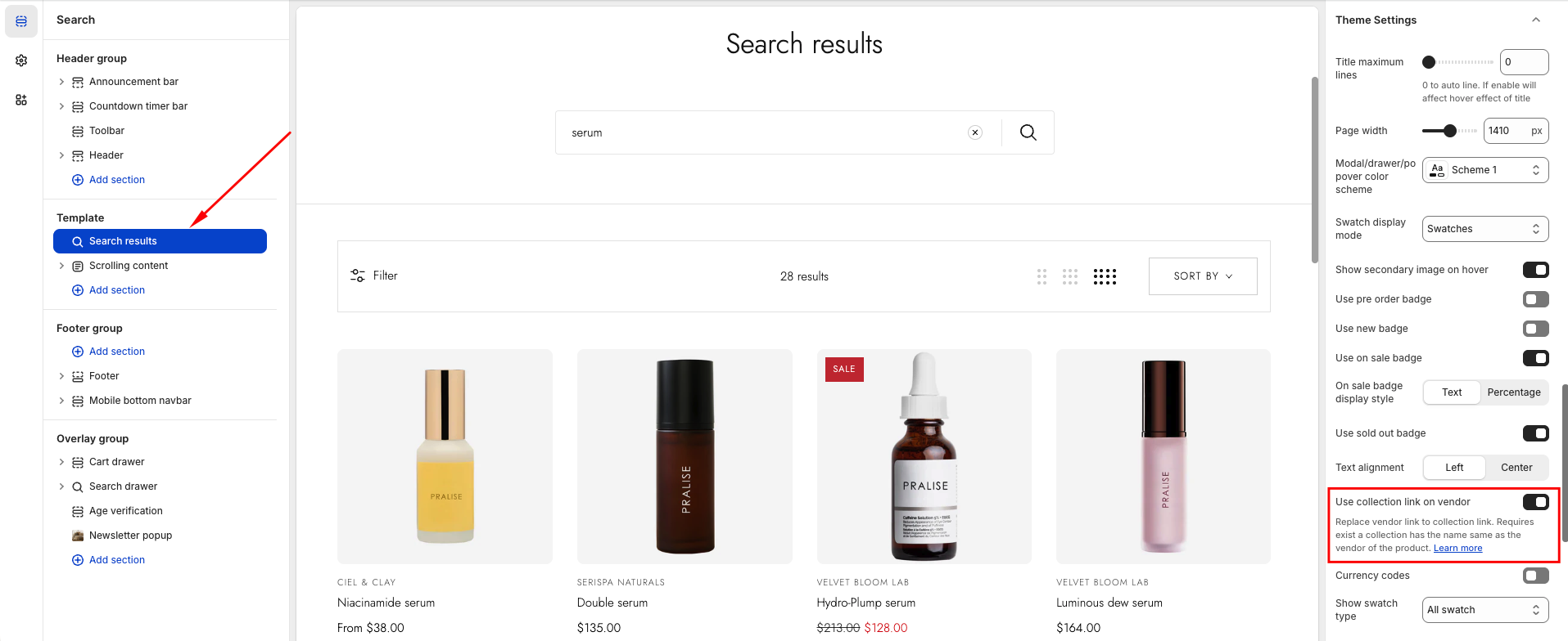 The settings for Filters, Product Badges, Vendor Links, and Color Swatches on the Search Page function identically to those on the Collection Page.