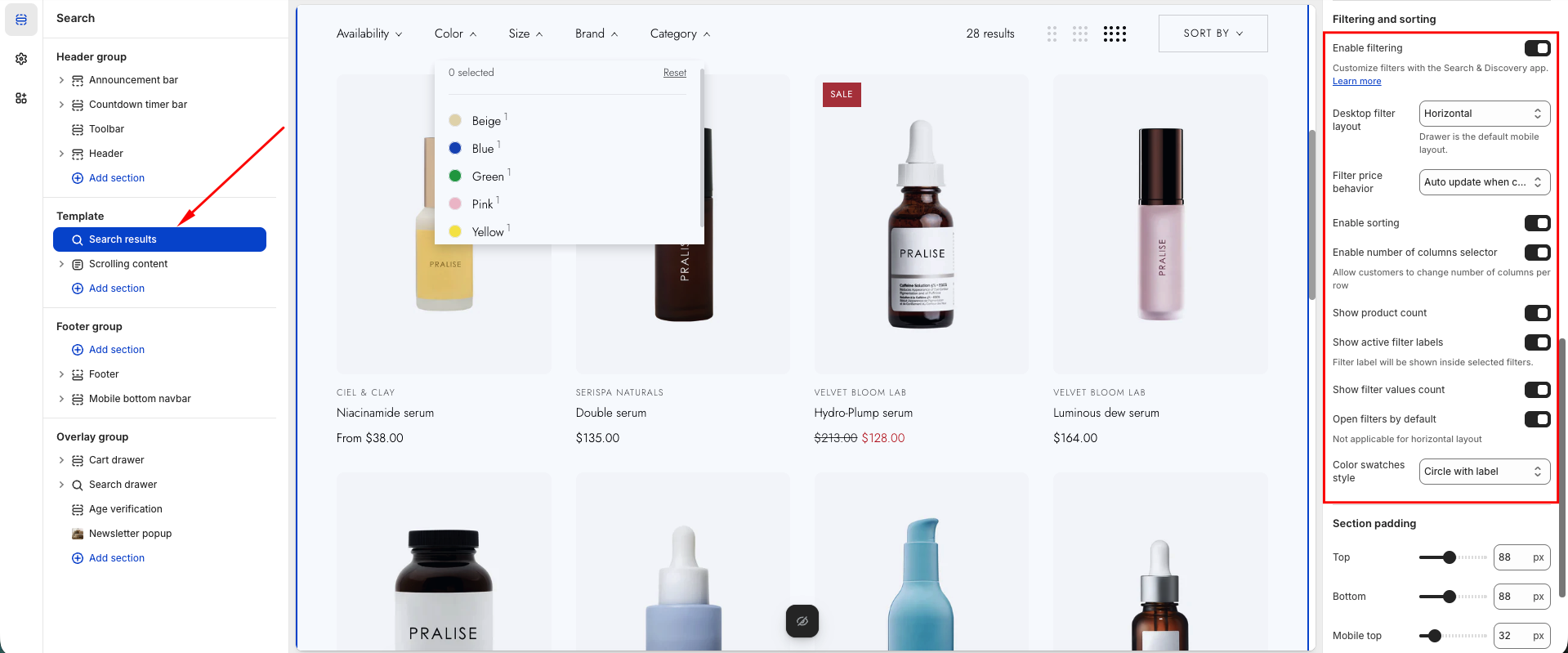 Enable Search suggestions: Toggle this to show relevant keywords and specific products instantly as the user types in the search bar.