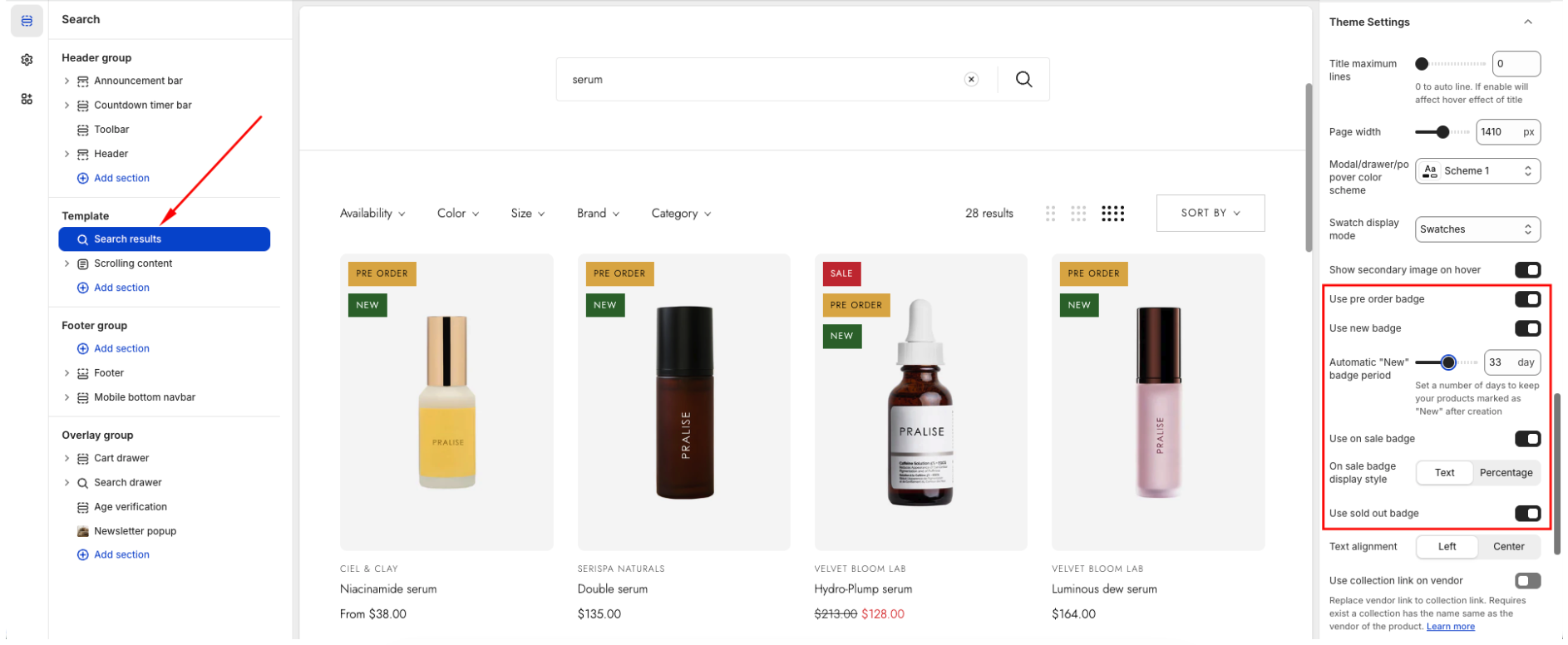 Badges: Managed in Theme Settings (New, Sale, Sold Out, Pre-order). ( Refer to this Documentation)