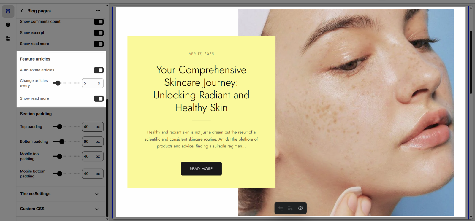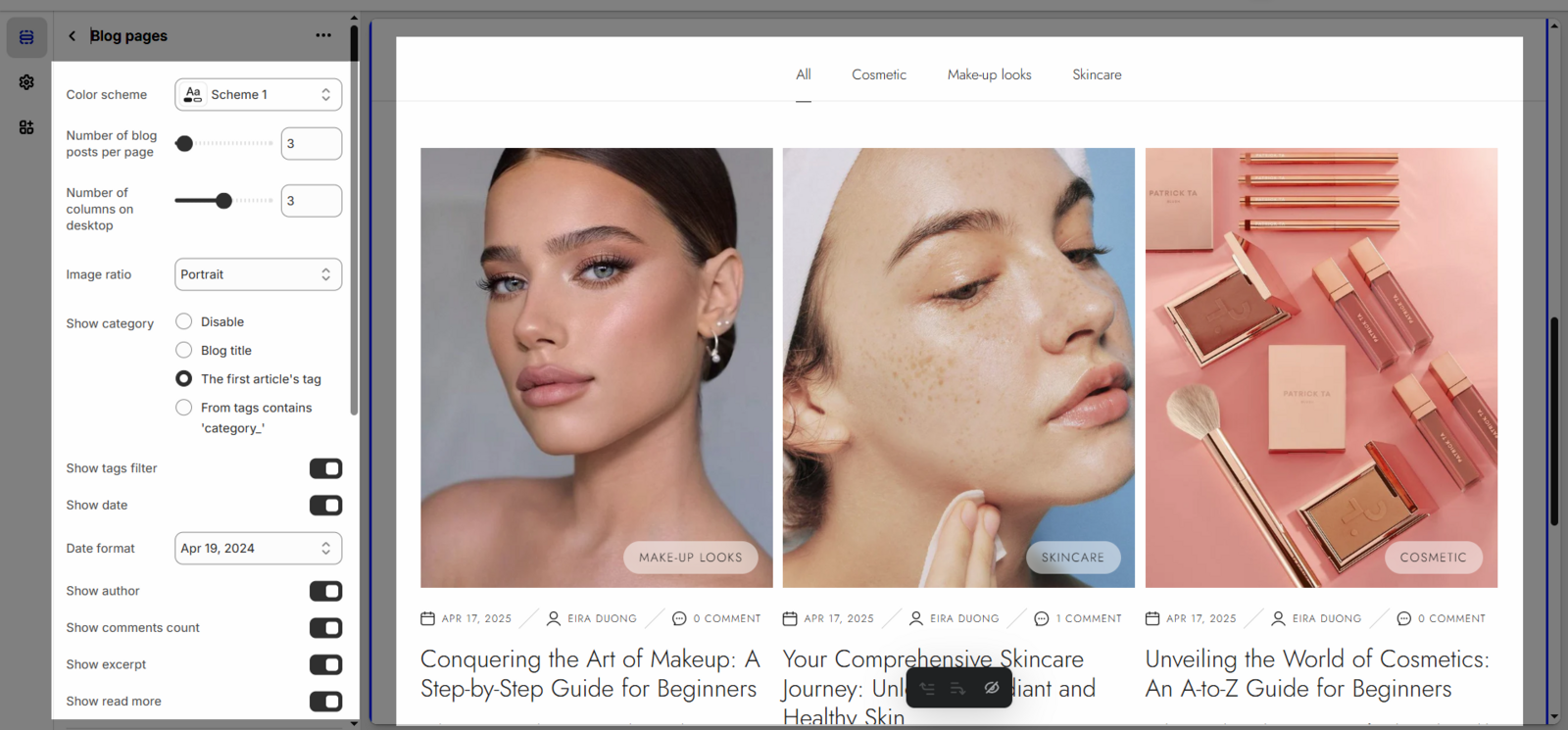 Show author: Another toggle to display the name of the author who wrote the blog post. This usually pulls the author information from your Shopify settings.