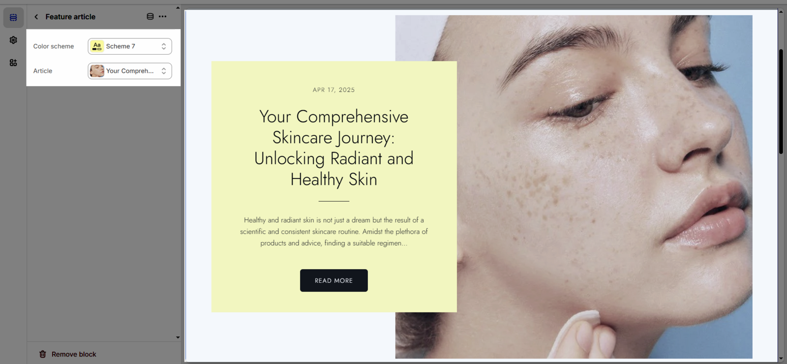 Color scheme: Selects the color palette for the Featured article block, ensuring harmony with the overall website design and creating a unified visual experience
