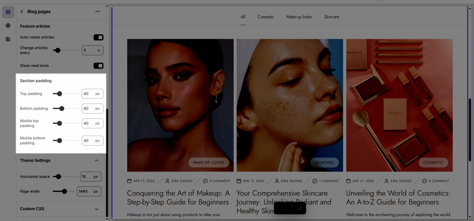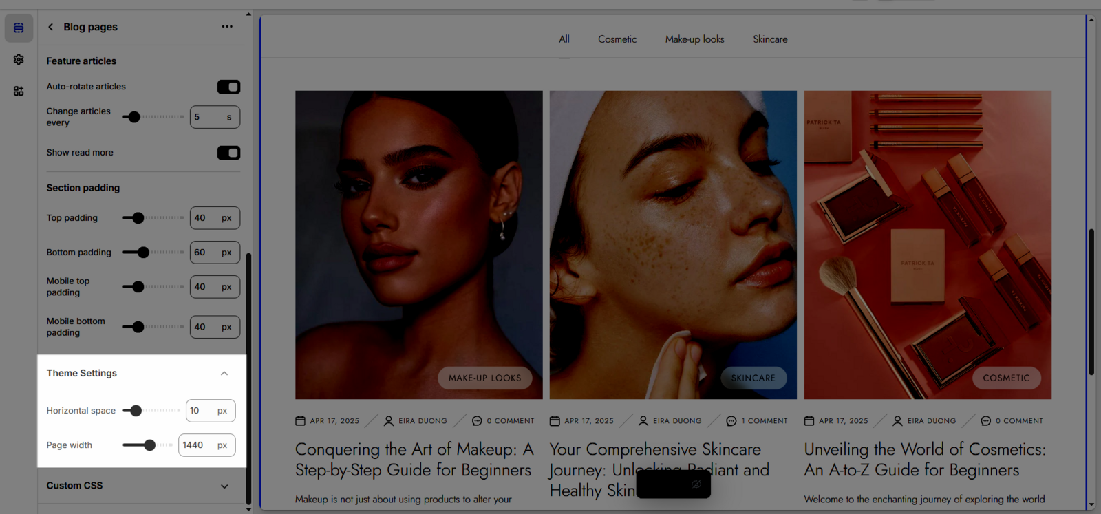 In the Blog page > click open Custom CSS tab