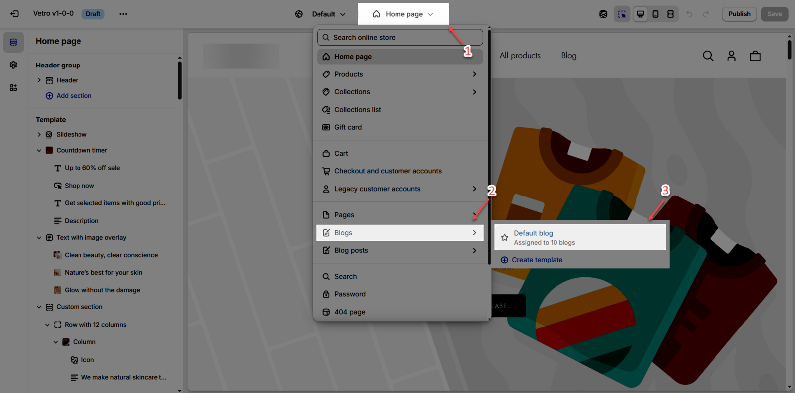 Step 02: In the theme editor (Customize), click to open dropdown pages in the topbar > select Blogs > select Default blog