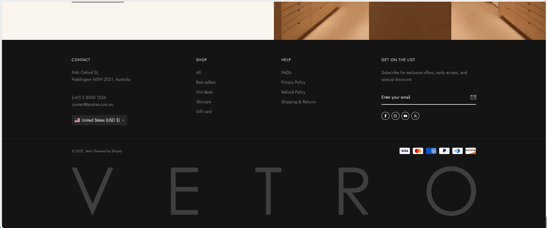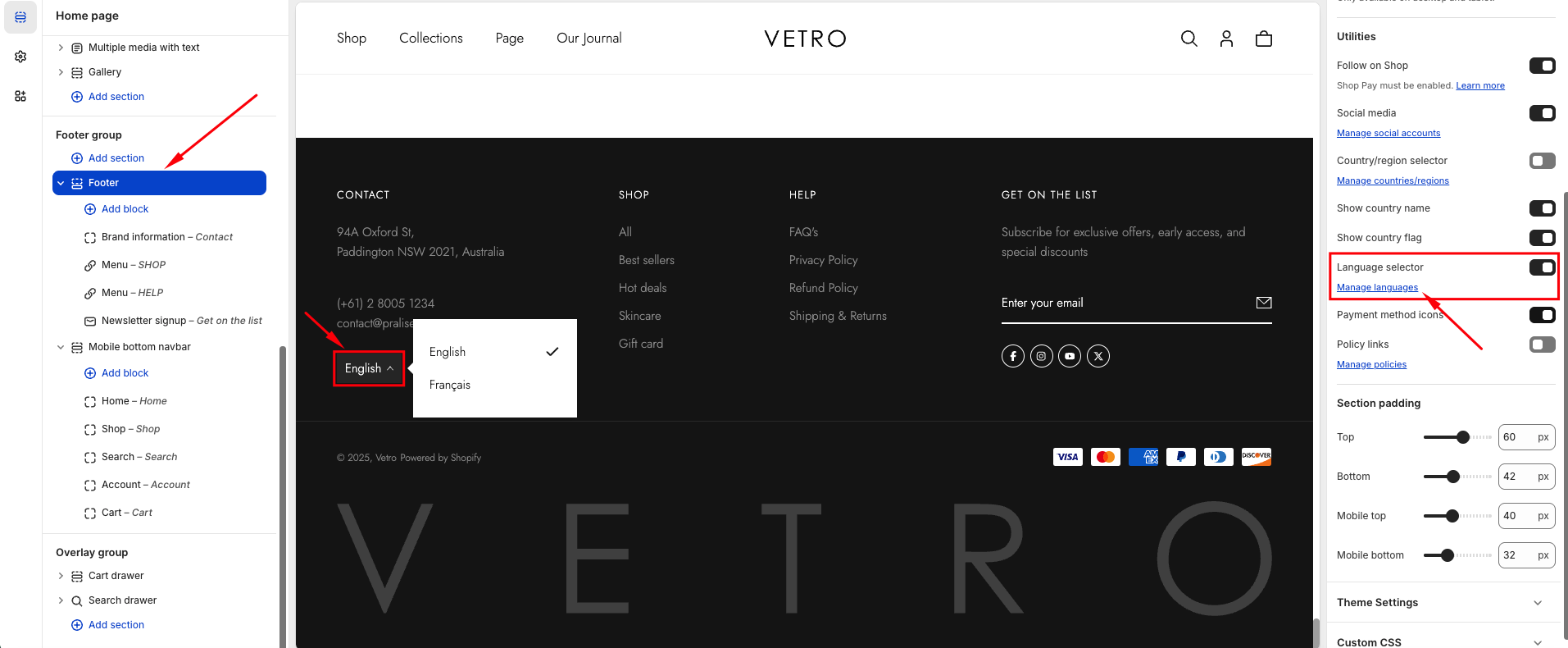 The Footer section appears at the bottom of all pages and provides merchants with customizable content areas for brand information, navigation menus, newsletter signup, contact details, social media links, and storefront utilities such as localisation selectors and payment icons.