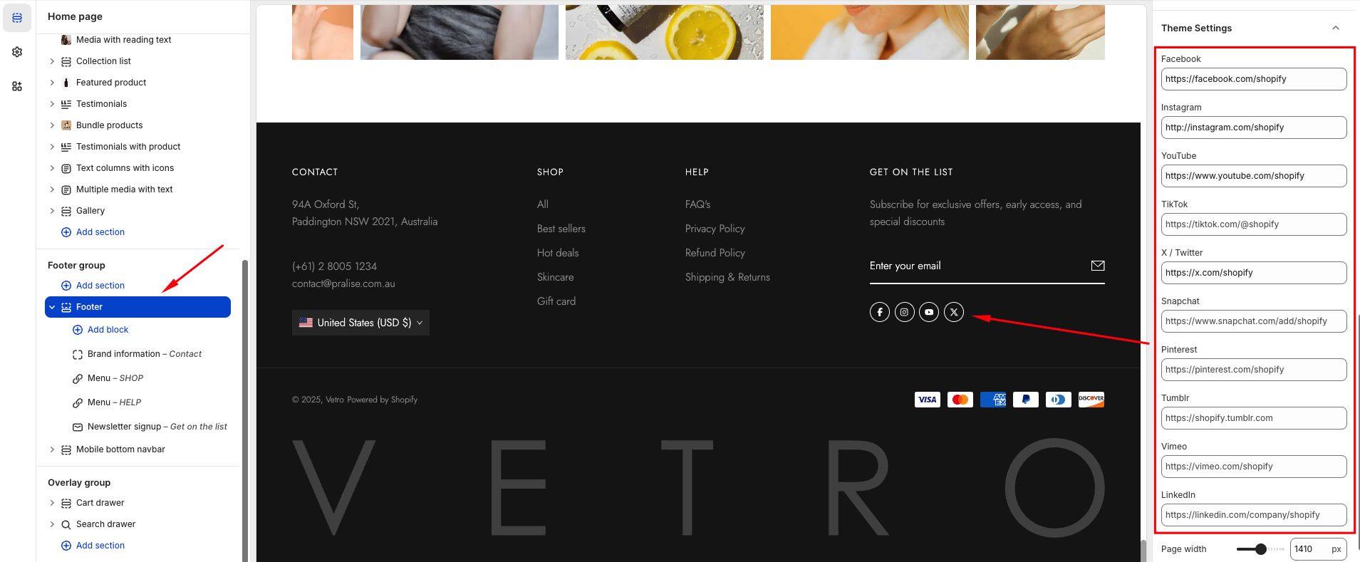 - Just add or remove the social URLs you want, and the footer will update automatically.