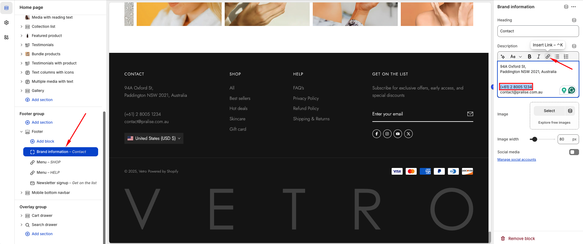 - Just highlight the text in the Brand Information field and click Insert Link to make it clickable.