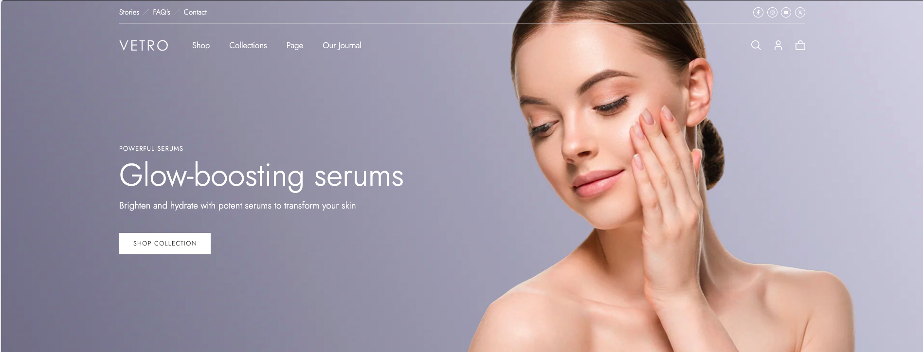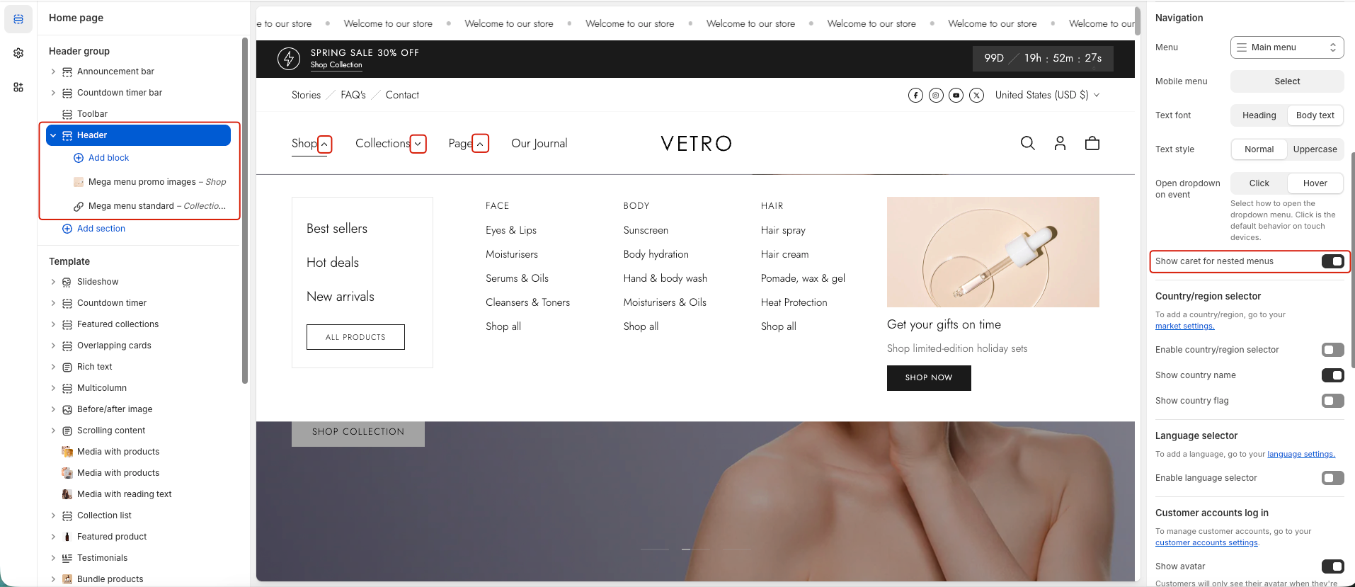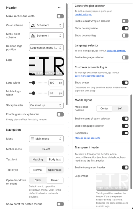 The header is the main navigation area of your store, displaying the logo, menu, account icon, language, and region selectors. You can customize its layout, colors, menu behavior, and how it appears on desktop and mobile.