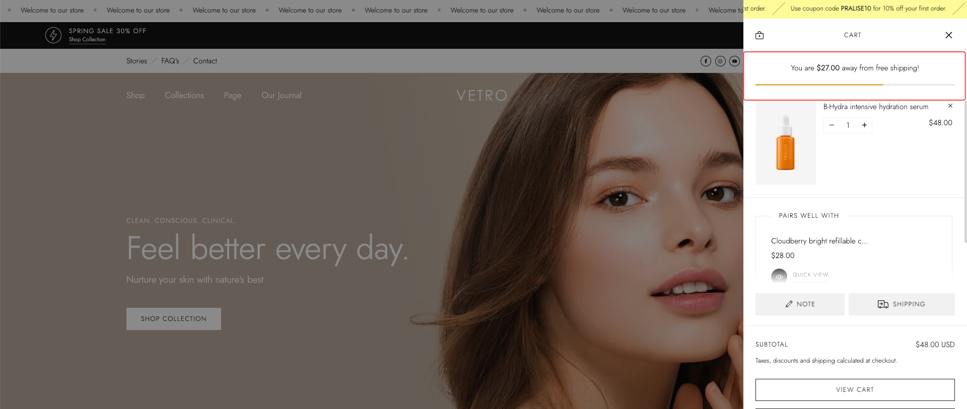 The Free Shipping Bar is a notification bar displayed in the Cart / Cart Drawer, showing how much more customers need to spend to qualify for free shipping. The amount updates automatically based on the cart total to encourage higher order values.