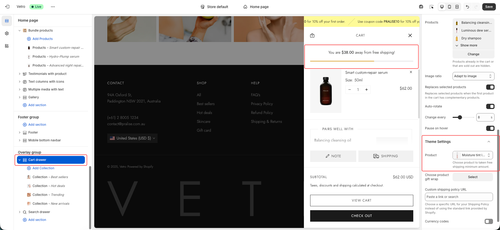 Cart / Cart Drawer → Scroll to Theme Settings → Click Product
