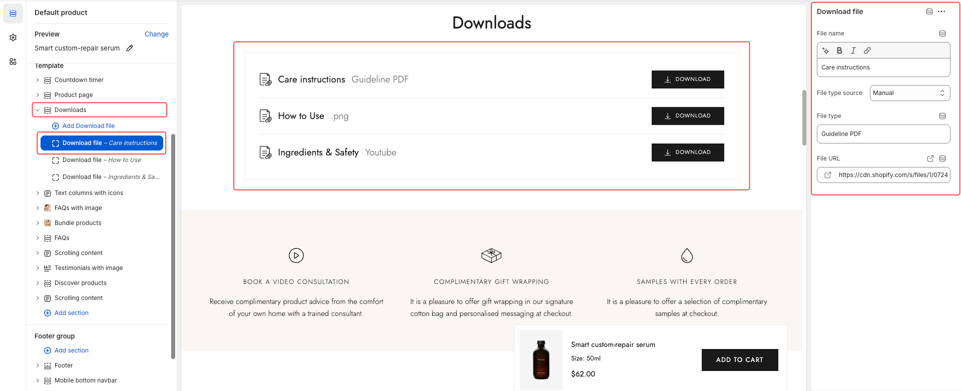 Add the Downloads section to the product page, then add a Download file block and manually enter the File name, File type, and File URL for each item.