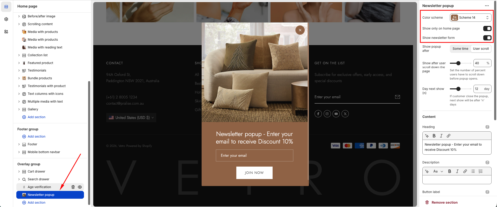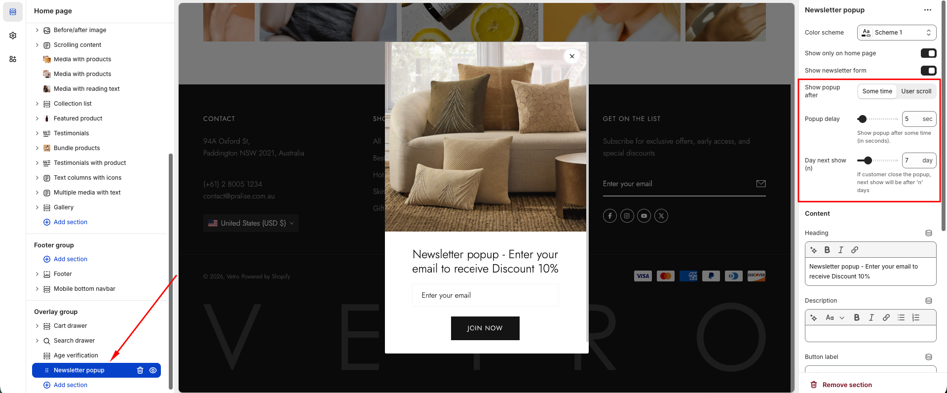 Show popup after: Choose Some time to trigger by a timer, or User scroll to trigger when the customer scrolls down.