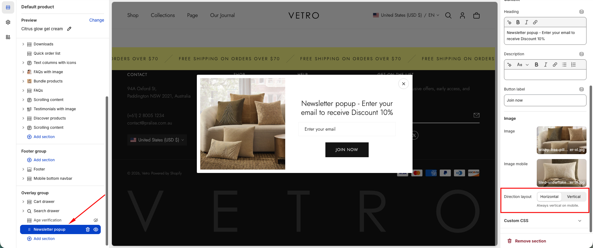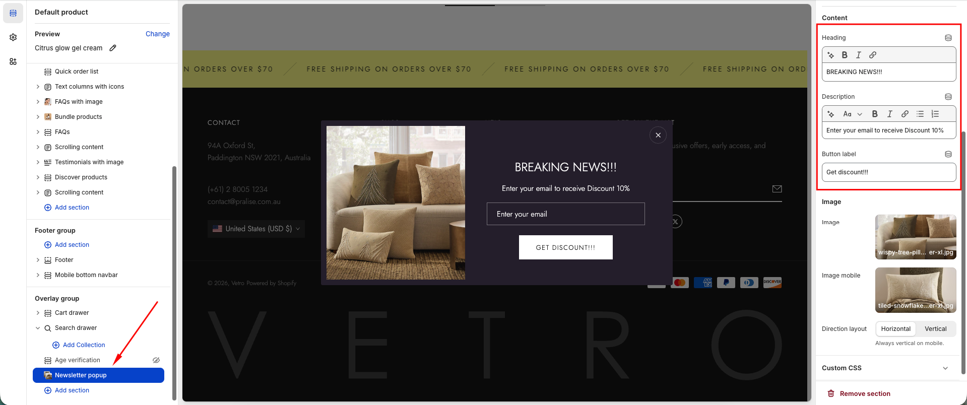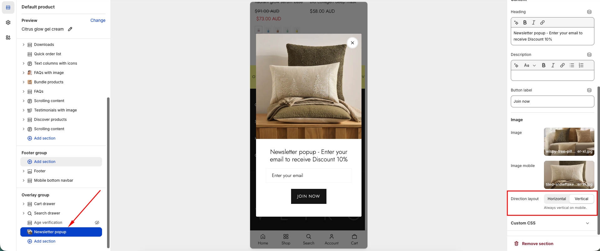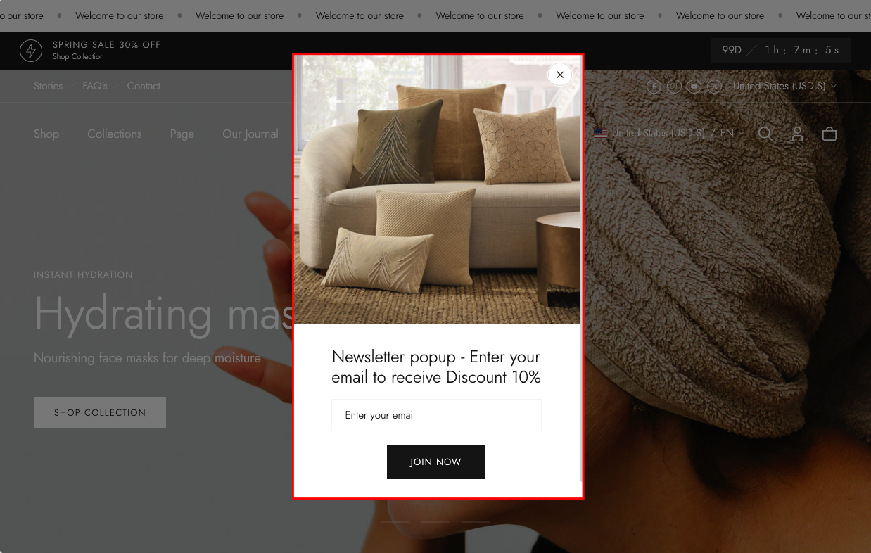 The Newsletter Popup helps you collect customer emails, share news, and offer special deals to grow your subscriber list. It combines engaging imagery with a customizable form to maximize conversions.