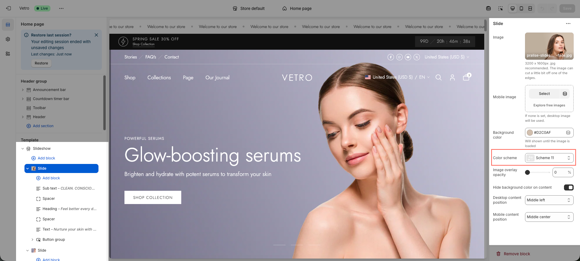 Go to Slideshow > Slide to change color. You can change the color of text, headings, and buttons by using the Color Scheme settings.
